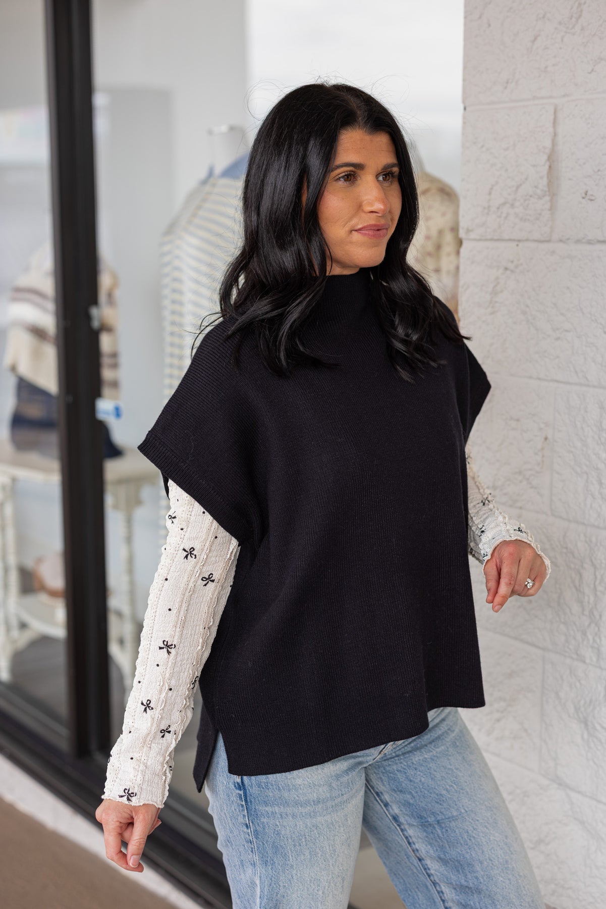 We are always happy in the Stylish Standards knit top! Show up to your fun upcoming events in this adorable black sweater. Featuring a mock neck and short dolman sleeves. Shop the look: Lace Bow Mockneck Top