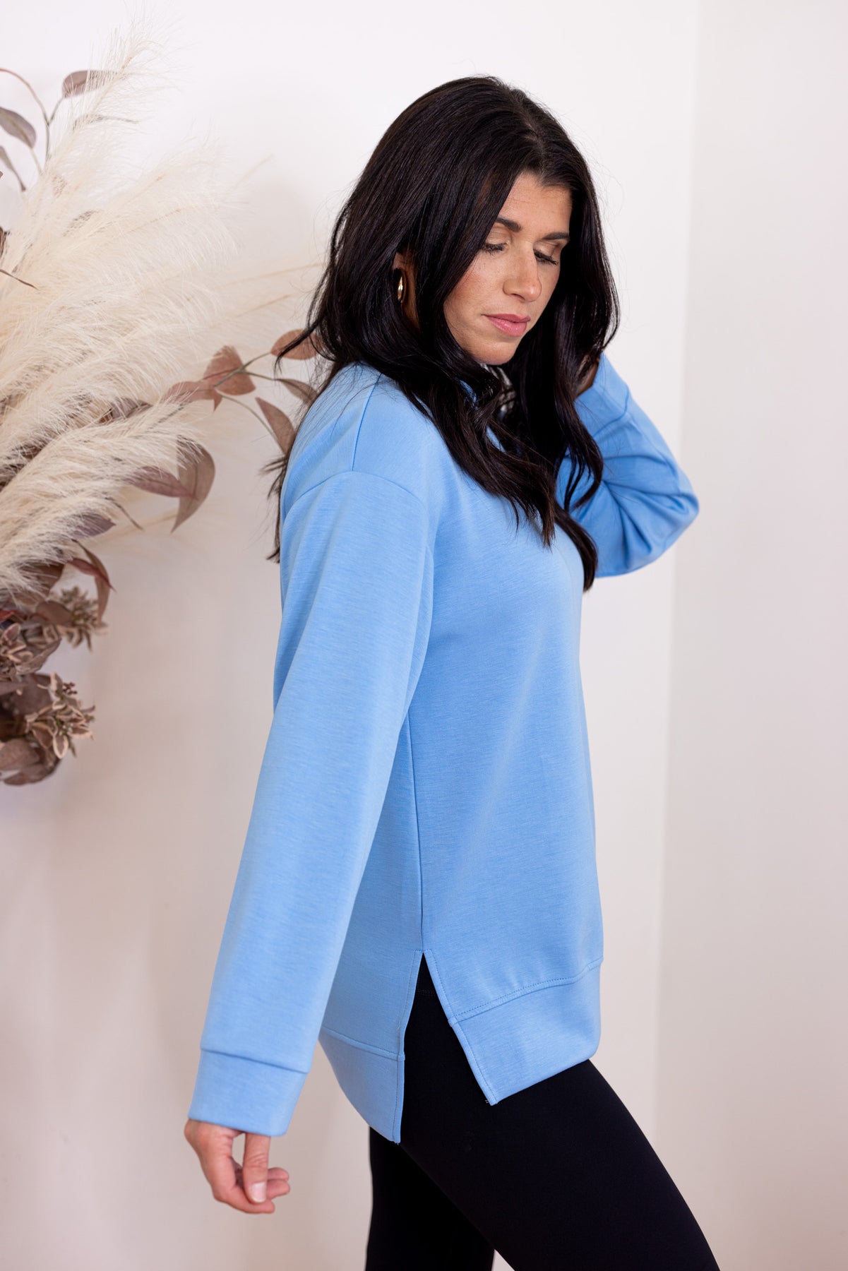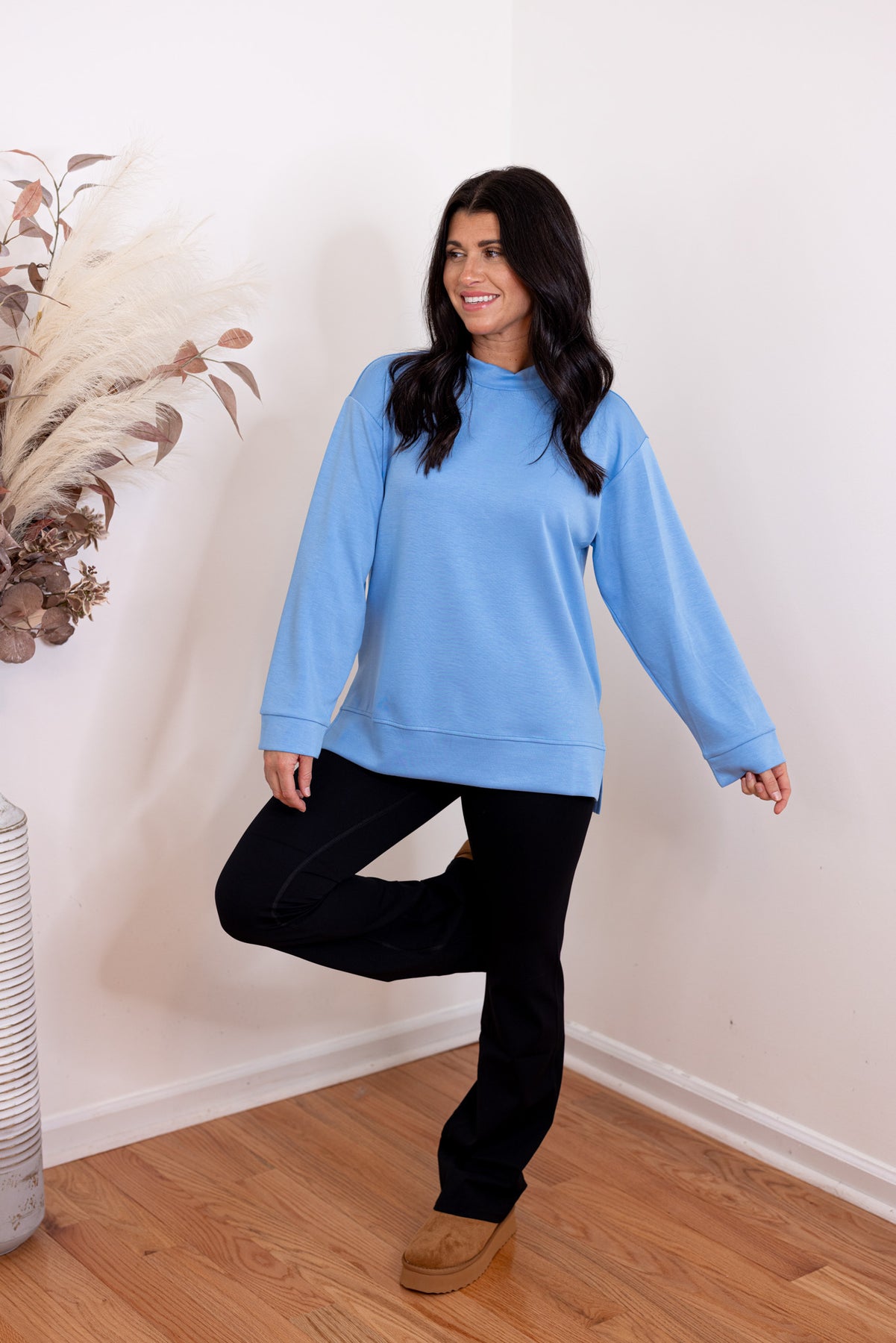 Step into style with our Scuba Knit Perfection blue top! This must-have piece features a mock neck and long sleeves with drop shoulder, perfect for any upcoming adventure. Made from luxuriously soft scuba knit, this top will keep you comfortable and looking effortlessly cool! Available in 5 colors HERE! Shop the look: Vest | Spanx Pants | Booties
