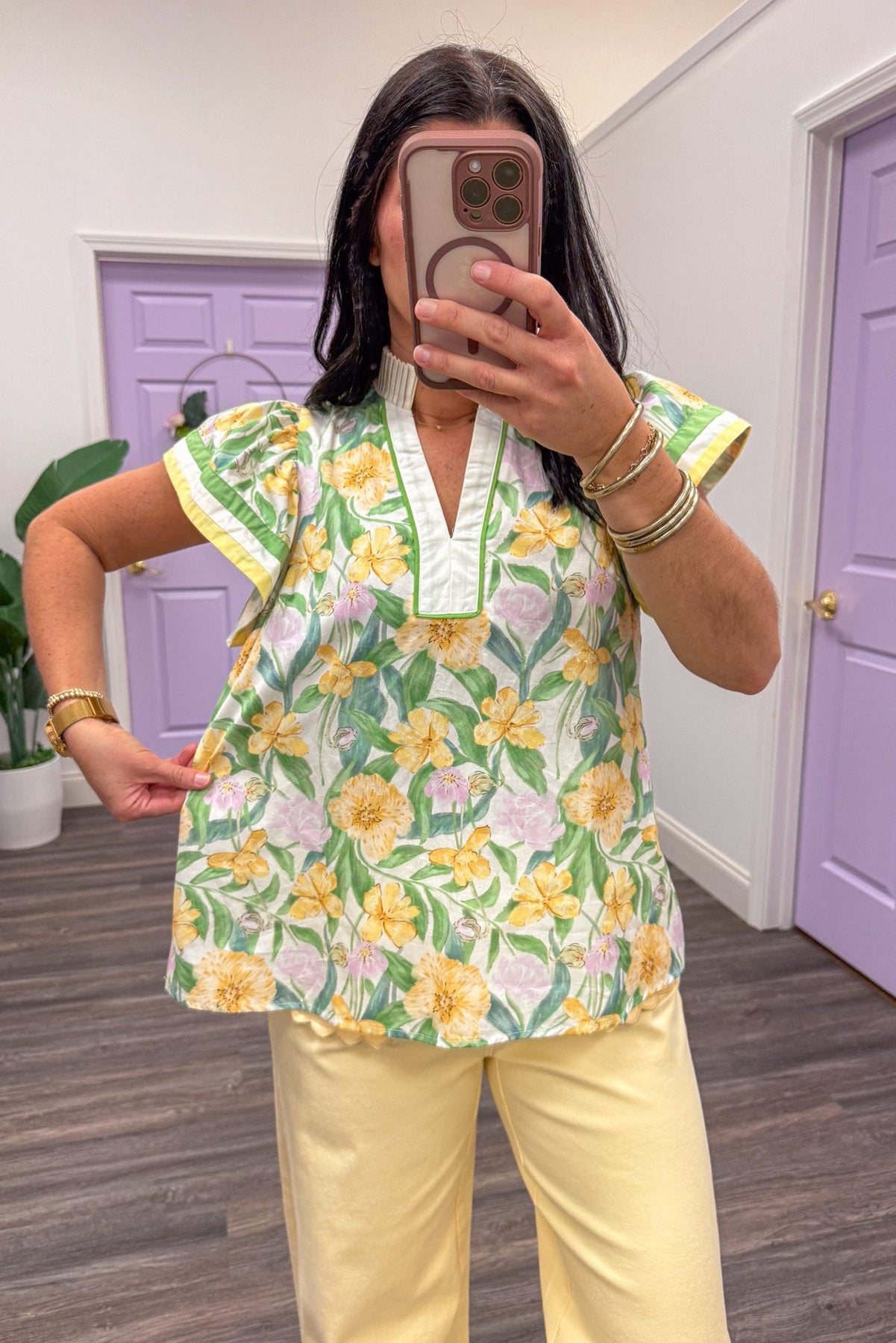 Brighten your day in this stunning yellow floral print top, designed with a flattering V neckline and romantic flutter sleeves. The lightweight fabric gives an effortless style, while the ruffle trimmed neck adds a polished finishing touch. This versatile piece transitions seamlessly from casual looks to special occasions, offering a cheerful pop of color and timeless elegance! Shop the look: Yellow Pants