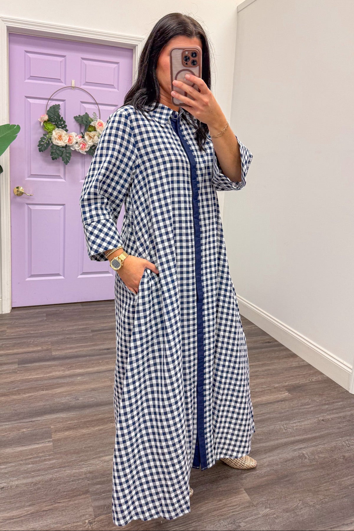 Embrace gingham charm in this delightful navy and white midi dress! Featuring a button down front hidden by yellow trim, a classic collar for a polished look, and 3/4 length sleeves. A flowy skirt adds movement and grace to every step, making this piece ideal for everything from picnic outings to weekend adventures!