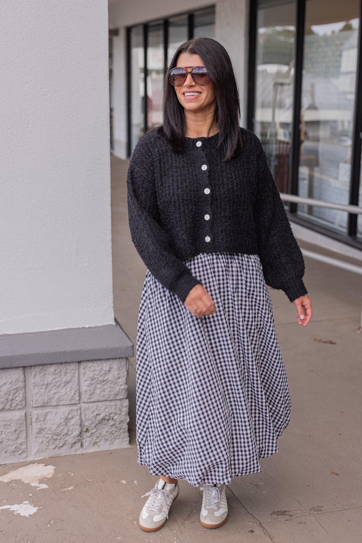 Step out in style with the Bubble Trends Black Gingham Midi Skirt, featuring a classic black and white textured gingham print that adds timeless charm to your wardrobe. The elastic waistband in the back ensures a comfortable, flexible fit, while the playful bubble hem brings a fun, flirty touch to your look. Perfect for casual days or weekend adventures, this skirt blends comfort with chic appeal effortlessly!