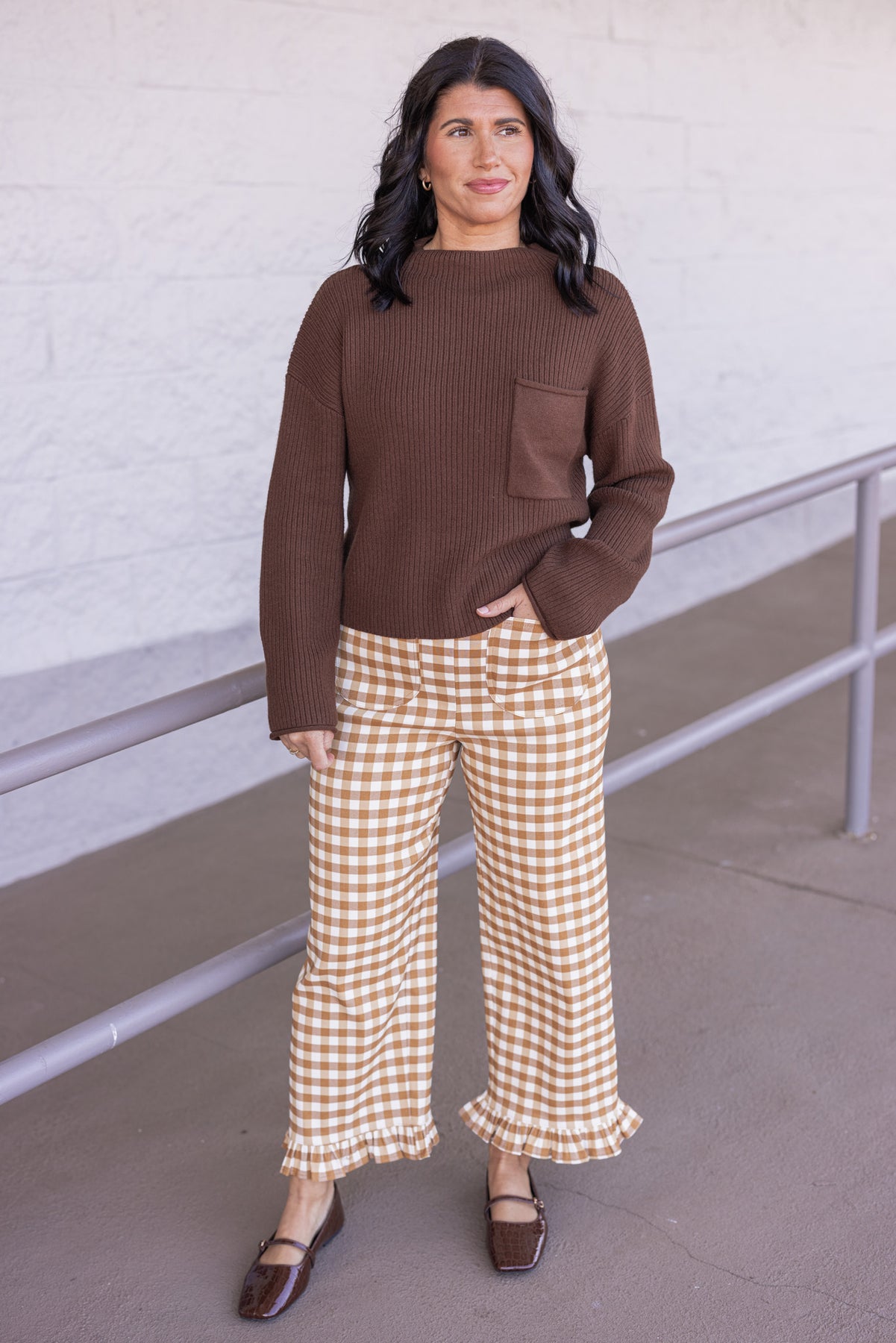 Add a playful pop to your wardrobe with these Mustard and Ivory Gingham Pants! Crafted from soft twill denim, they feature a smooth waist with a hidden back zipper for a seamless fit. Front patch pockets add casual charm, while the straight legs end in flirty ruffle cuffs that move with you. Perfect for mixing timeless patterns with a fun twist! Shop the look: Chocolate Brown Sweater | Brown Flats