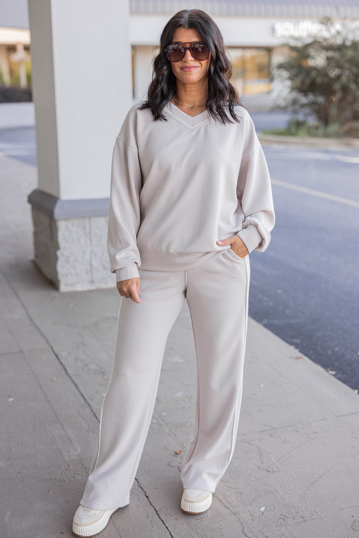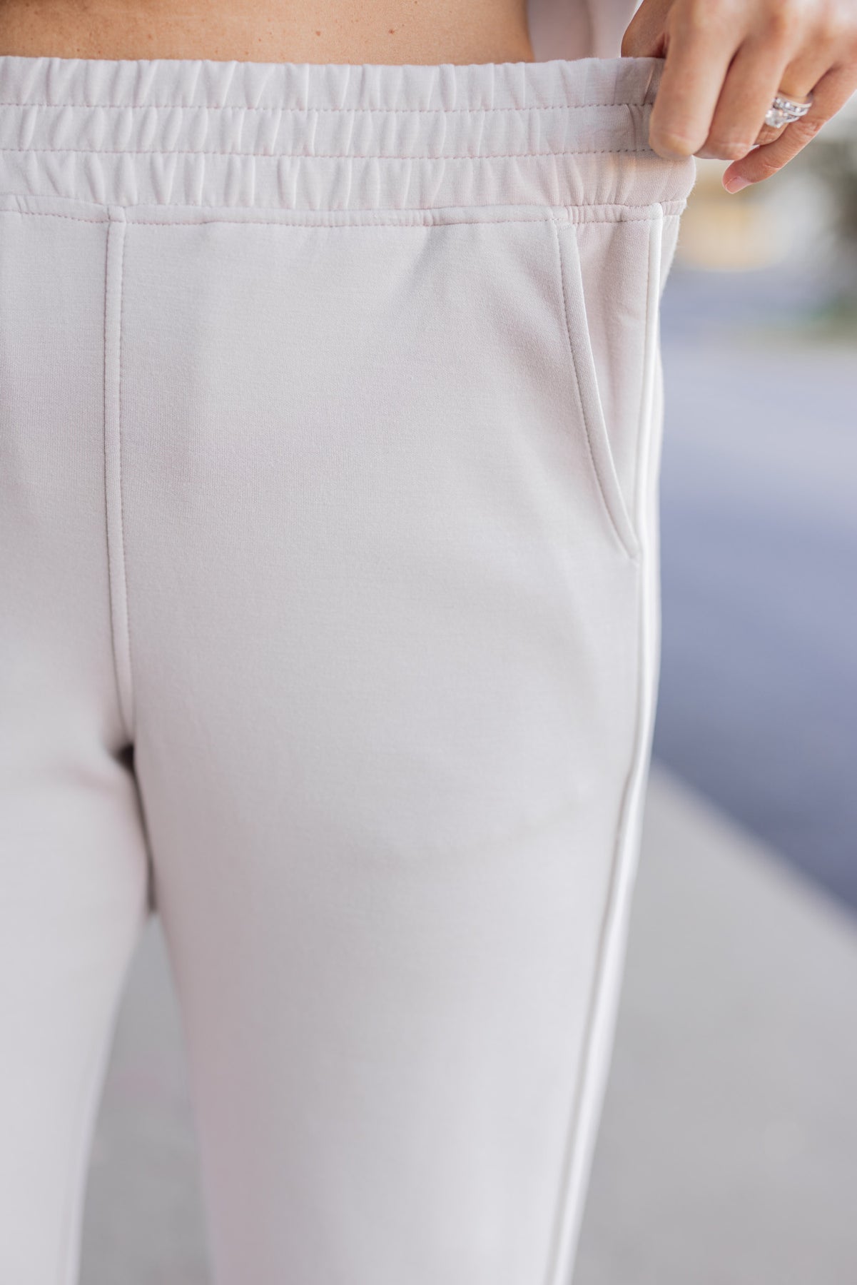Get ready to strut your style in these adorable pants! Made with a mocha cream soft scuba knit fabric with ivory striped piping down the sides. The elastic waistband and straight legs provide a comfortable fit, and they have a matching top here. Grab these before they're gone! Also add this Ivory Sherpa Vest that's available in 4 colors, to complete the look!