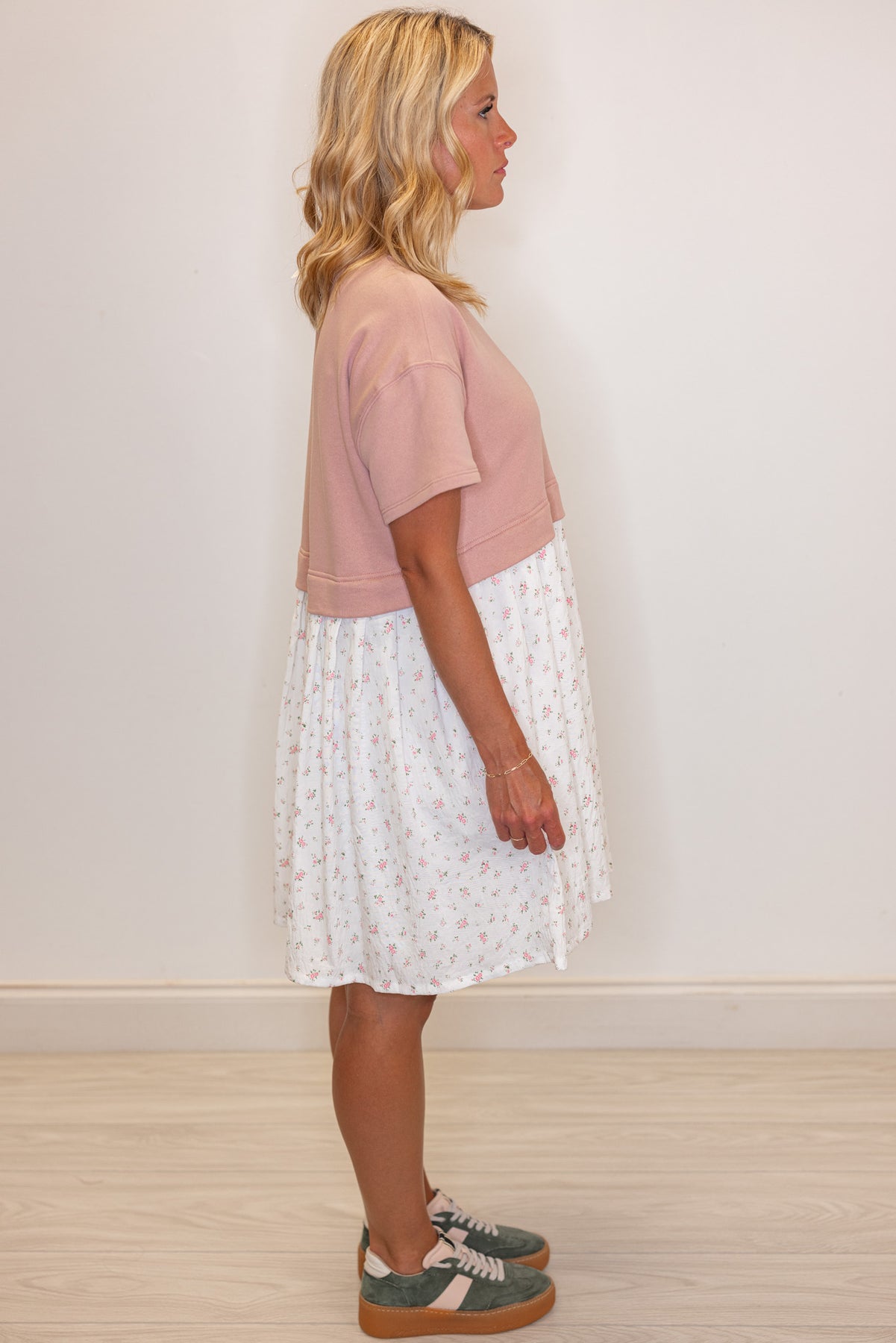 We just ADORE a contrasting fabric dress! Introducing Mixed Emotions, our new favorite outfit! She has a mauve knit top mixed with an off white floral print woven skirt, and features a crew neckline, short sleeves, and side pockets. Perfect all season long, no matter where the day takes you!