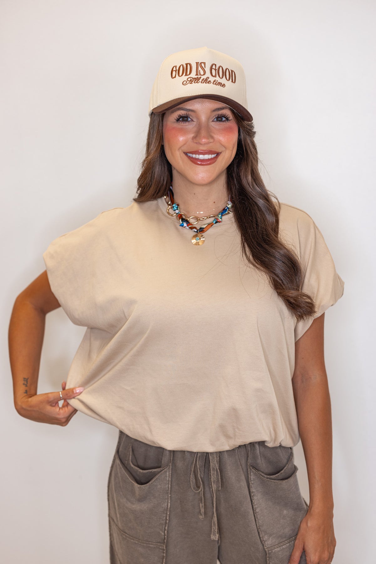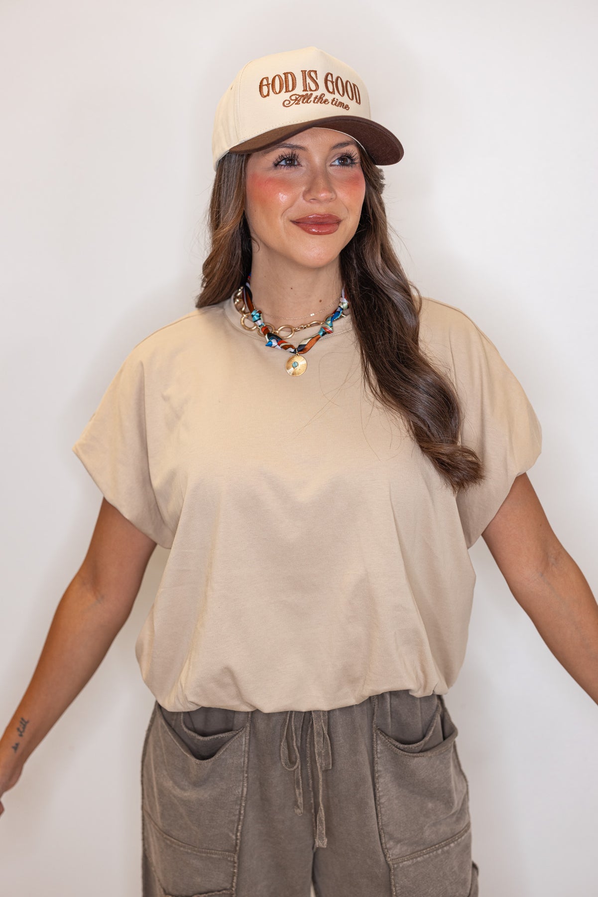 Bubble hems are THE CUTEST! Check out this adorable tan knit top, featuring gathered elastic short puff sleeves, and a trendy bubble hem, all in a semi-cropped style. An elevated basic that will always be a closet staple! Shop the look: Pants