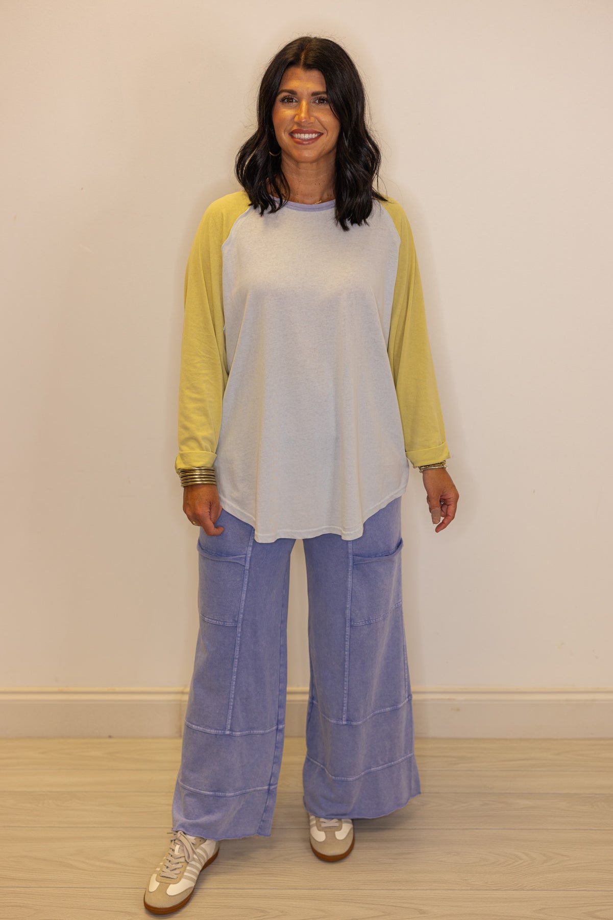 Escape into total Sweetness with this adorable Colorblock top! Featuring a crew neckline, 3/4 length sleeves, and a bottom hem - all in a colorblock pattern of light blue, dijon yellow and purple knit fabric. Lightweight and perfect for all seasons. Shop the look: Pants | Sneakers