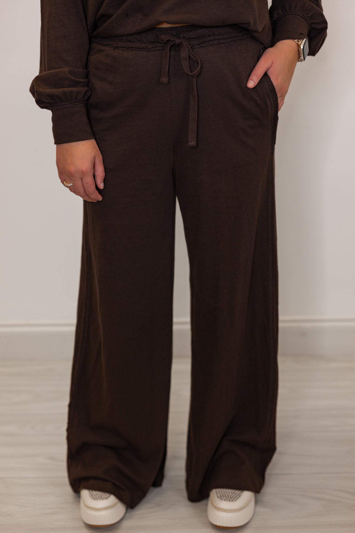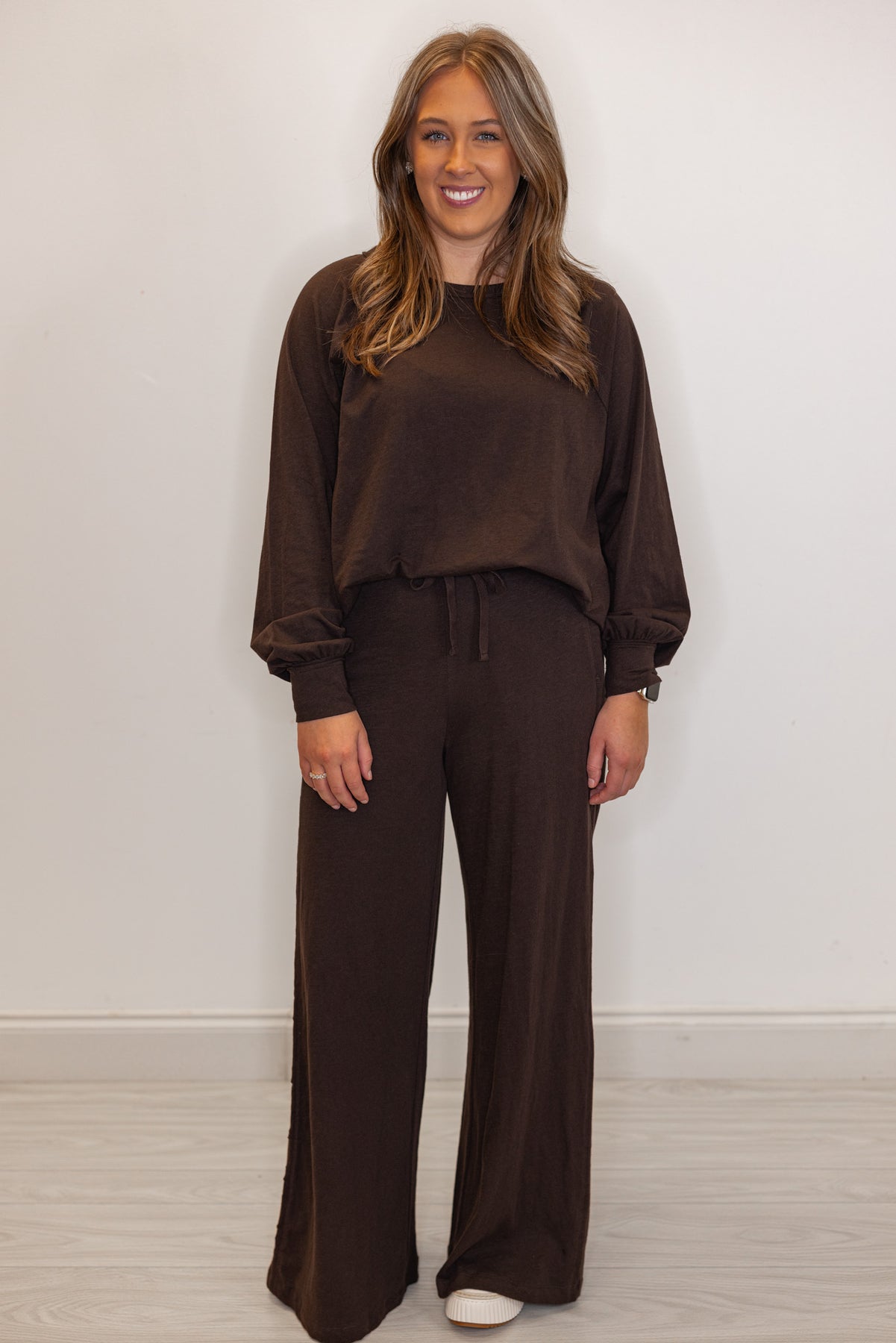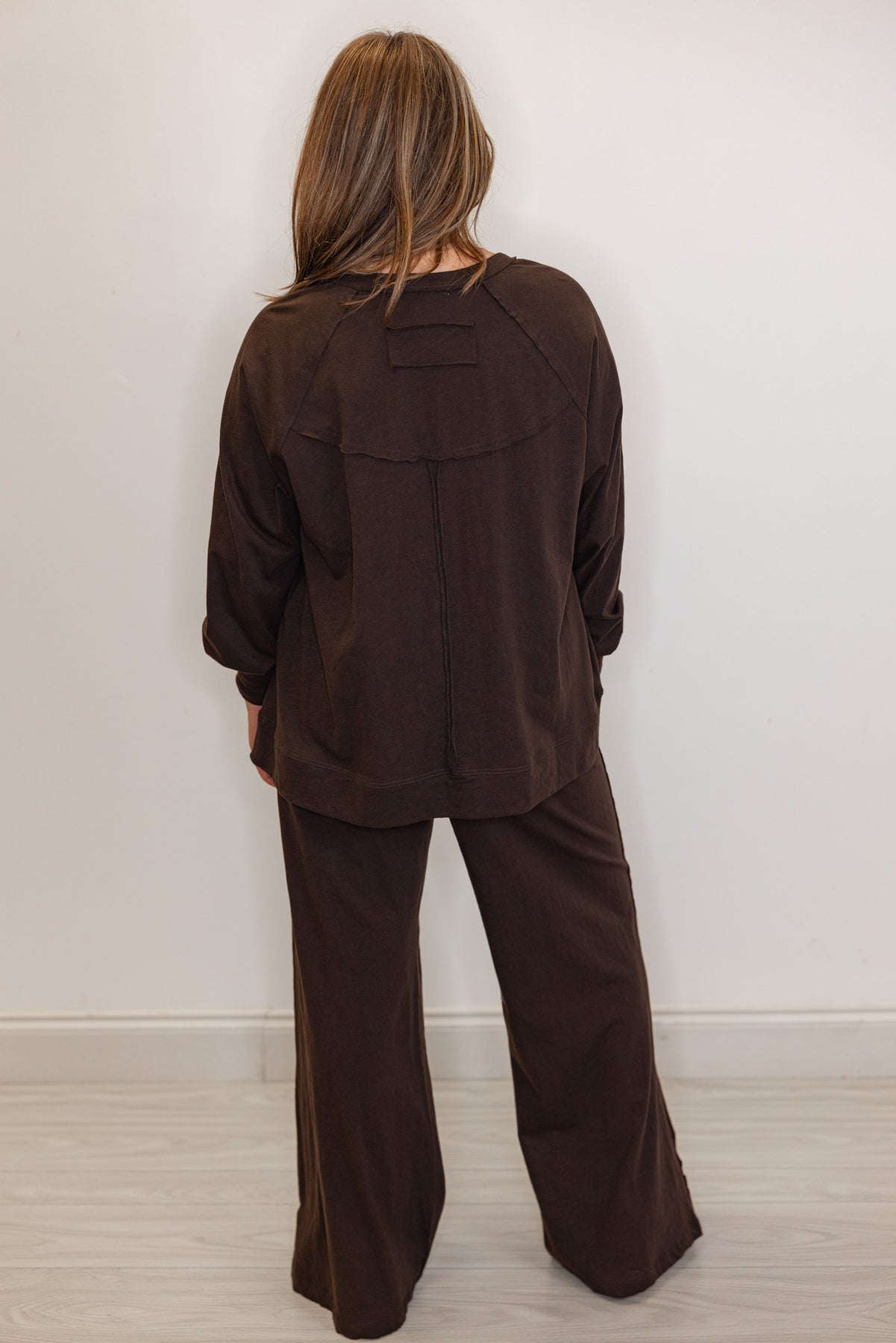 Women's dark brown cotton pants with matching long sleeve tee