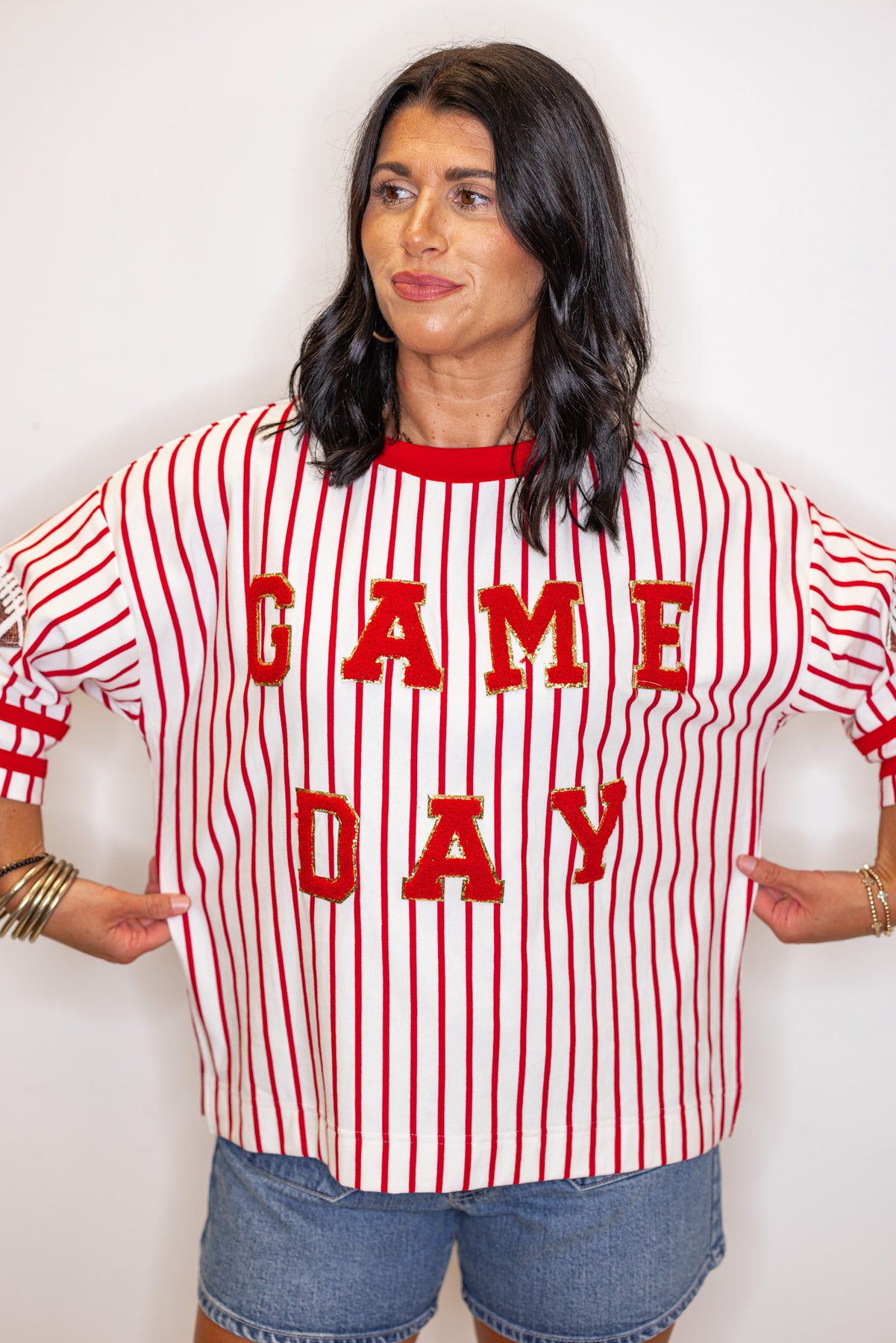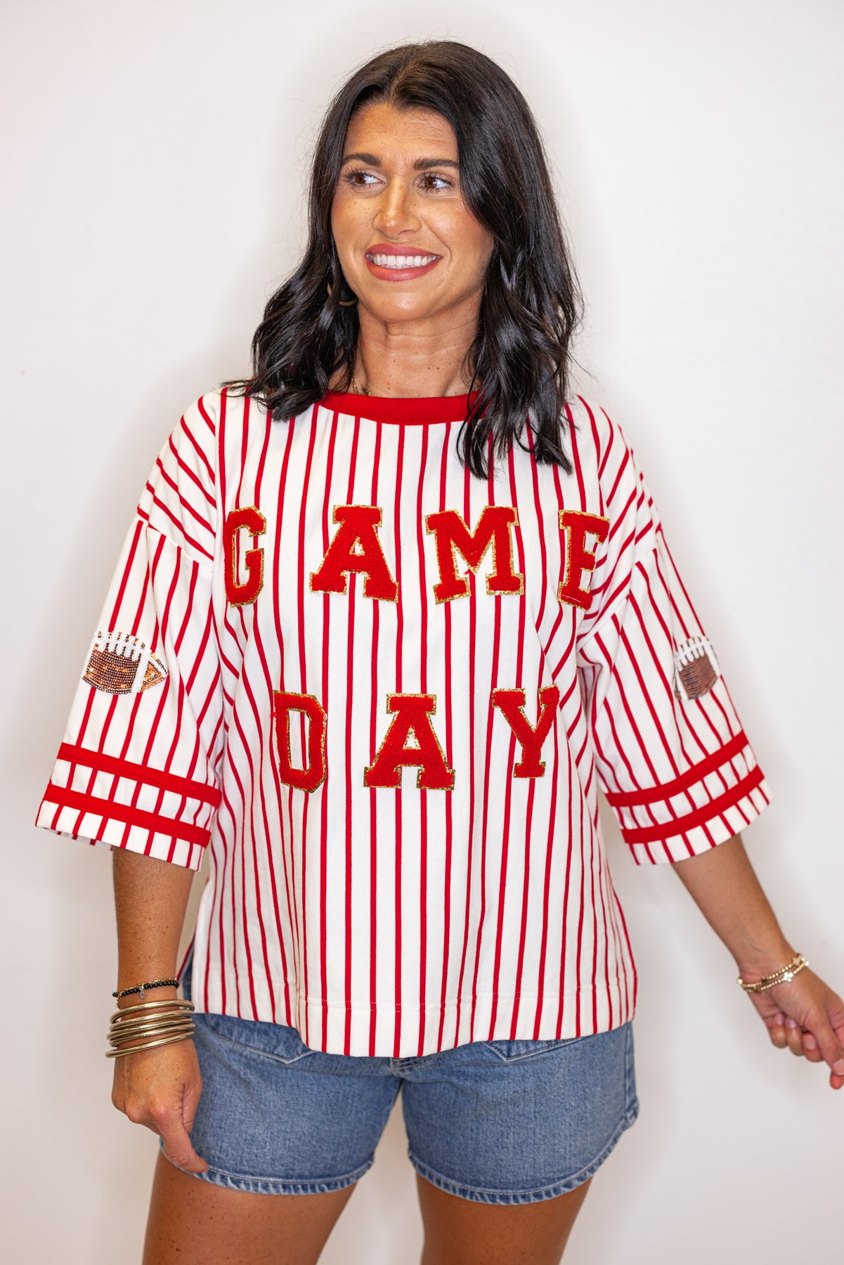 Cheer loud and proud in the Gameday Stripes Red Knit Top! This french terry knit top offers a relaxed fit with 1/2 length sleeves and a comfy crew neckline - perfect for any football fan. The gold trimmed 'Game Day' center patched design adds a playful pop of color while the sequin football detail on the sleeves shows your true football spirit!