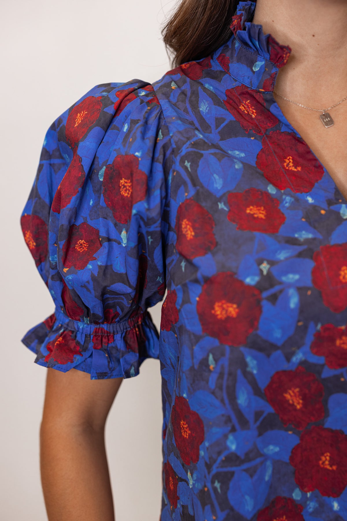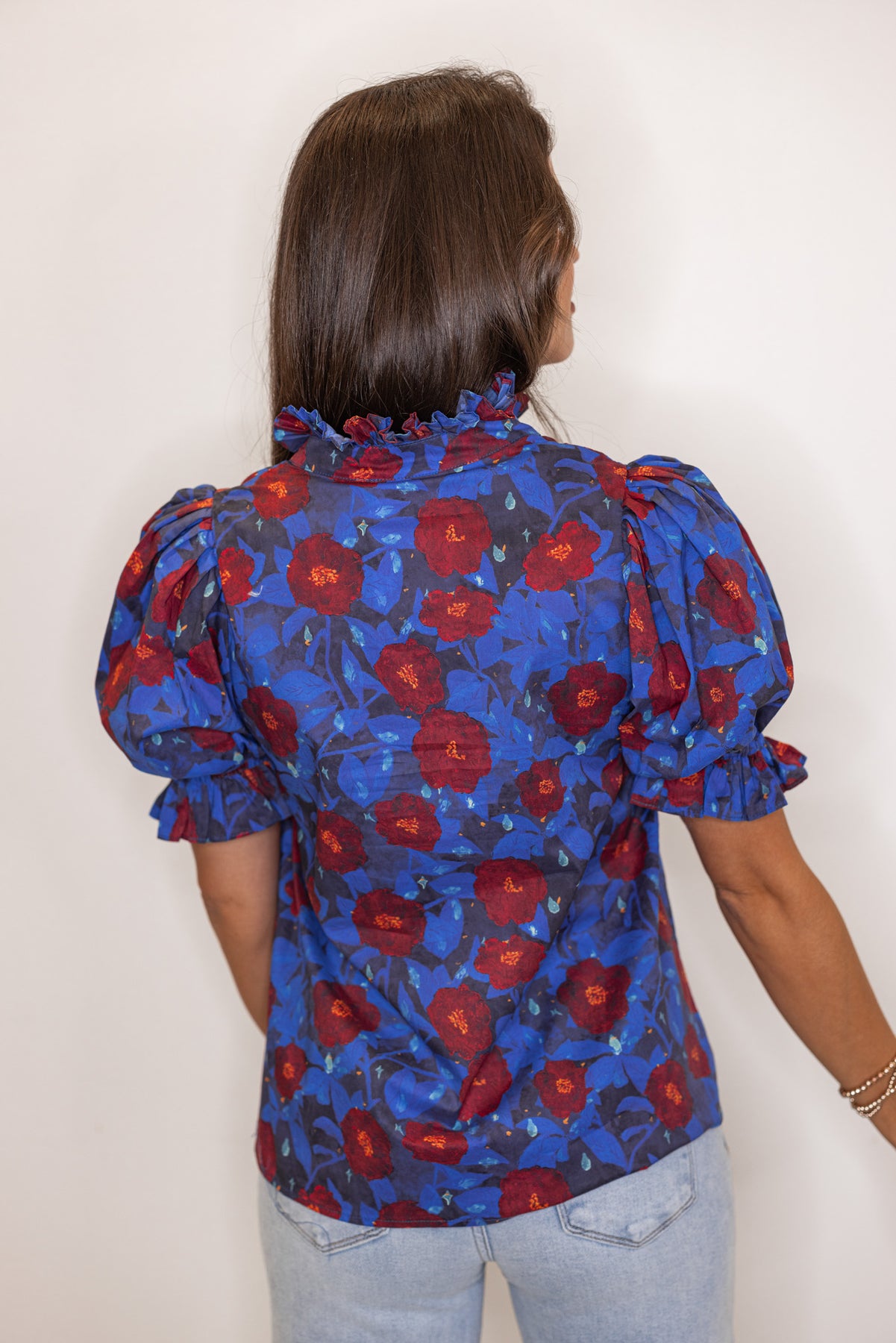 Make a vivid Floral Statement in our Midnight Florals Dark Blue Top! Featuring a v cut neckline with a ruffle detail around the neck, and ruffle trimmed puff sleeves. The perfect floral top to make a sassy declaration!