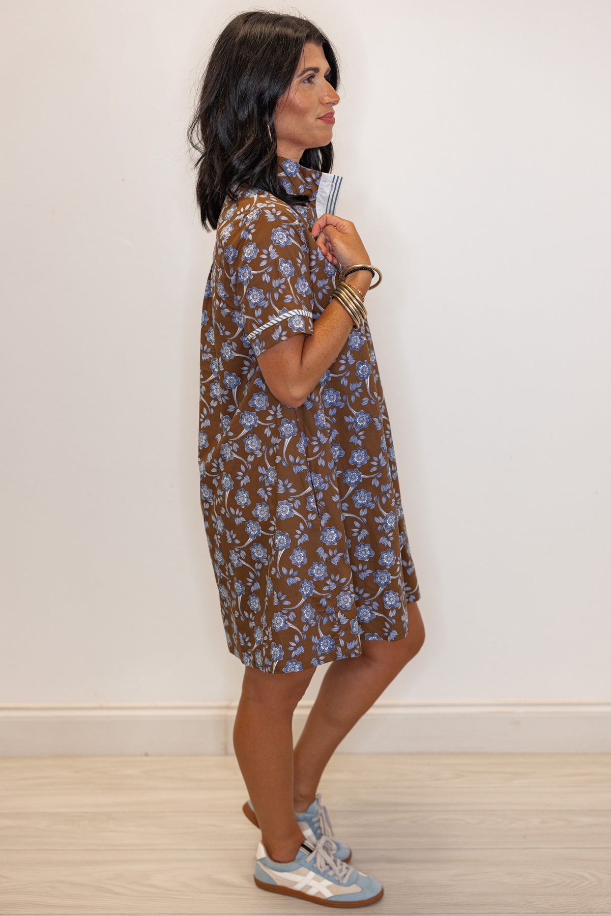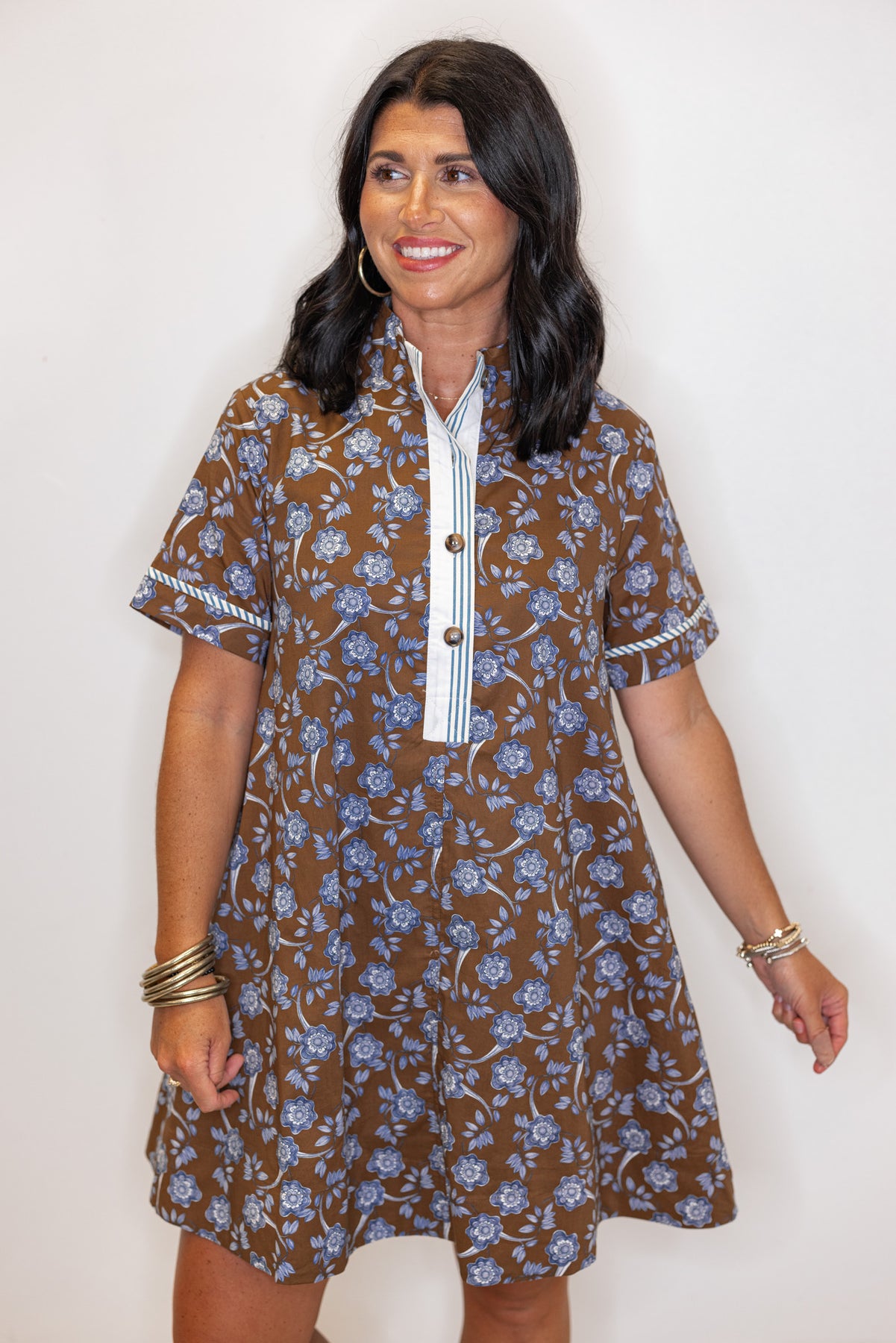 Step into a whimsical Autumn with this brown dress adorned in charming blue floral prints. Playful cream and blue striped trim add a fresh twist, while the button-front bodice invites a touch of vintage flair. Perfect for twirling through crisp fall days in style!