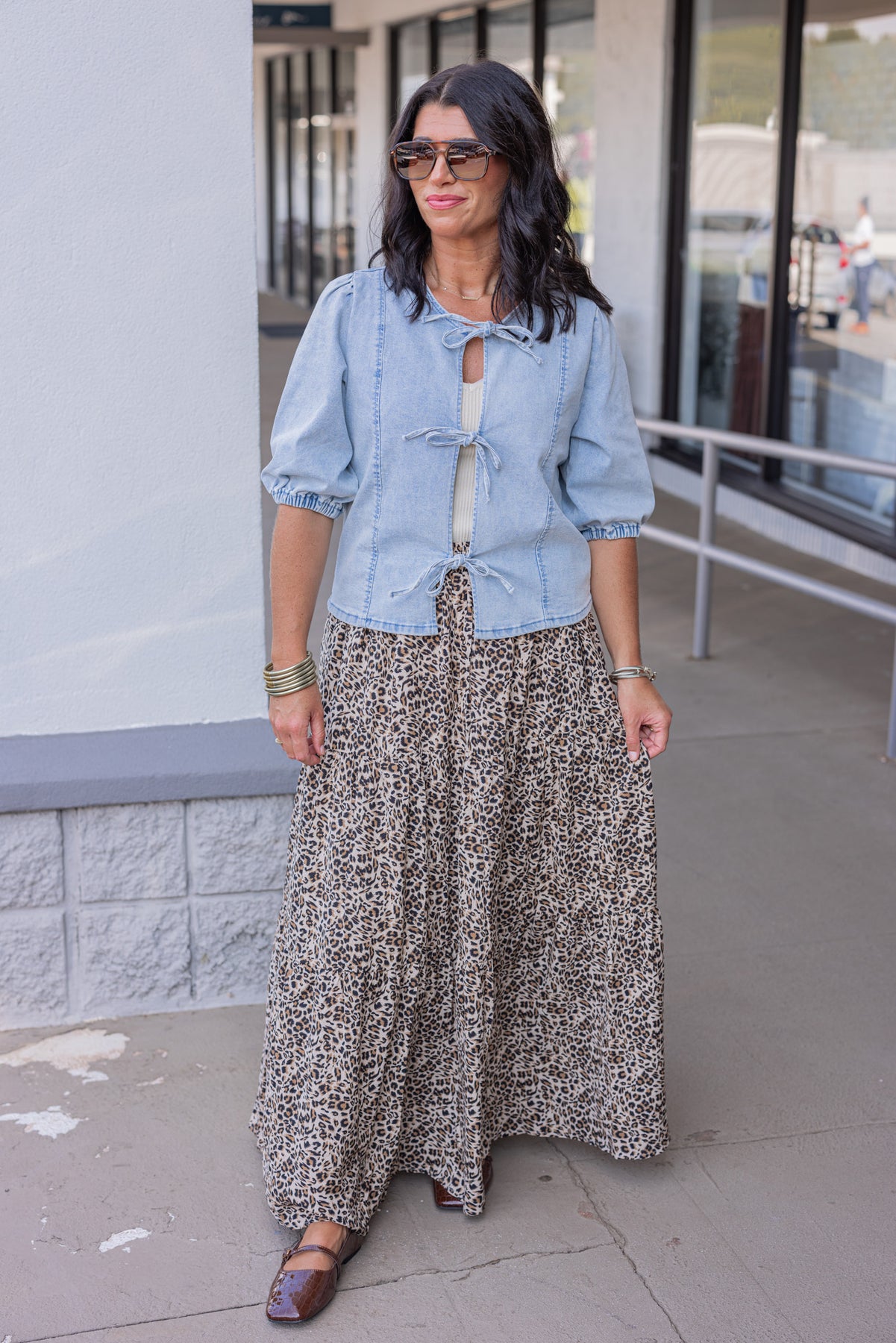 Add a touch of playfulness to your wardrobe with our Bow Accents Blue Denim Top! The bow tie closure and peek a boo bodice provide a fun and flirty twist, while the washed blue denim adds a classic vibe. Short puff sleeves complete this unique and stylish look. Shop the look: Layering Tank | Skirt | Brown Flats
