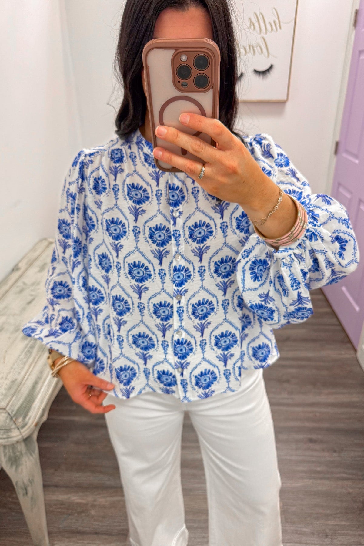 Entro brings the season with the Bright Floral Future Top, featuring a stunning royal and light blue floral print on a white background. This lightweight top is perfect to transition into the Spring weather ahead! Pair with the best selling twill denim pants here!