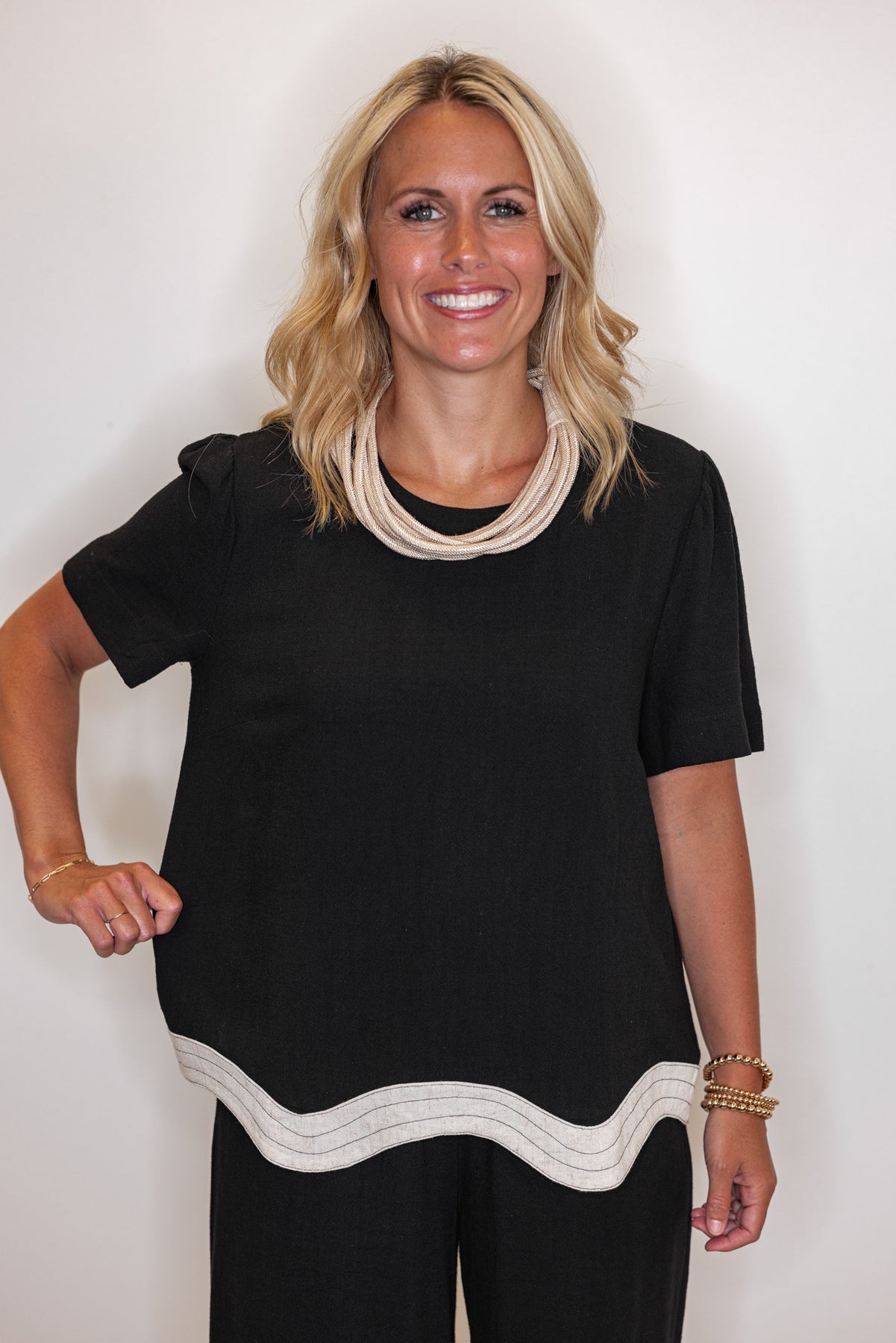Wake up to Dreamy Perfection, the adorable top your closet NEEDS! Featuring black linen fabric, with short sleeves, and an oatmeal scalloped bottom hem. Perfect for adding a touch of charm to any day out! Shop the matching pants here for a super cute and trendy outfit!