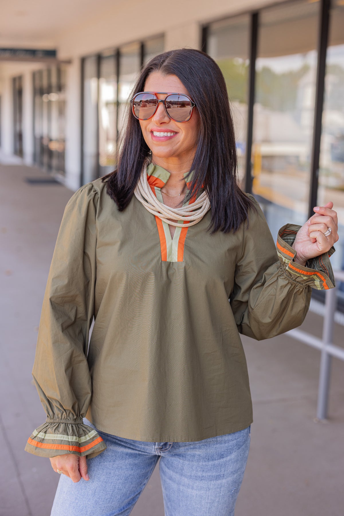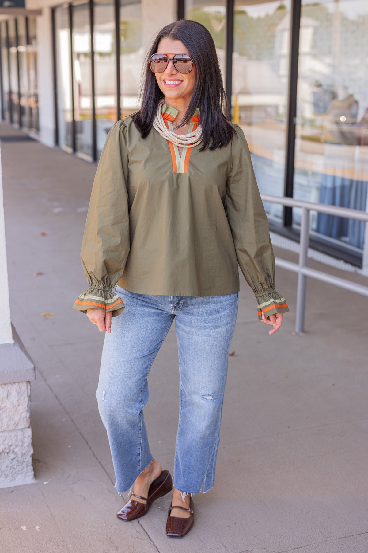 Embrace effortless elegance with the Festive Days Olive Poplin Top, featuring olive poplin fabric accented by vibrant orange and light olive trim details. Its long balloon sleeves end in delicate ruffled cuffs, adding a touch of whimsy, while the ruffle trim around the neck creates a charming focal point. This is the perfect top to bring a fresh, festive look to your wardrobe with comfort and style!