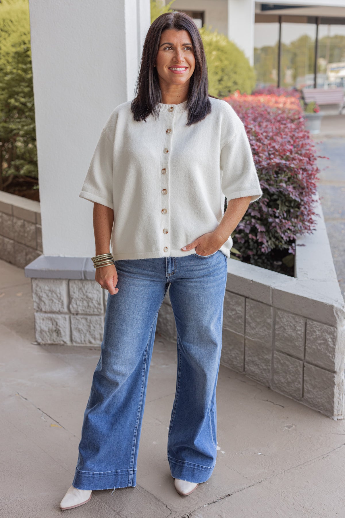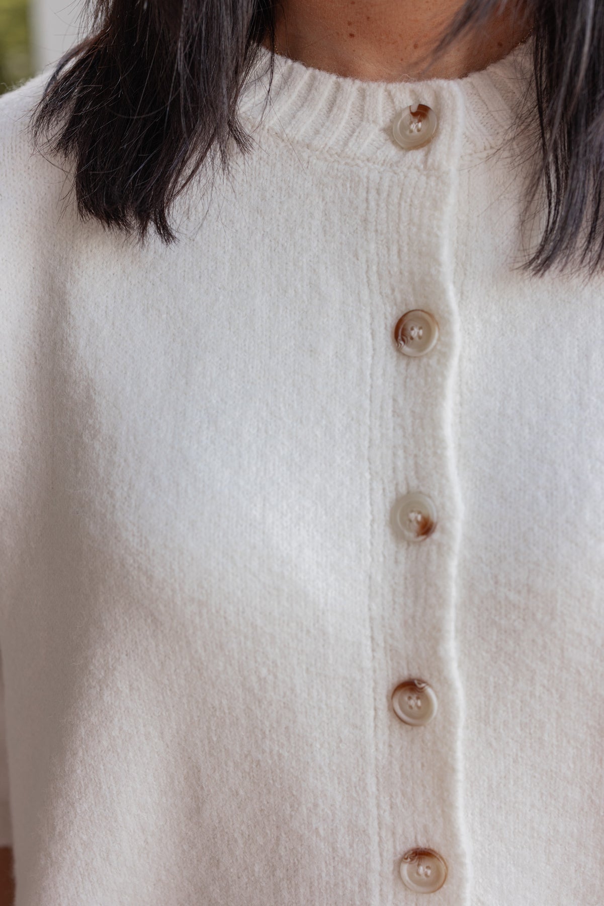Women's off white brushed knit button front top by Wishlist showing true to size fit