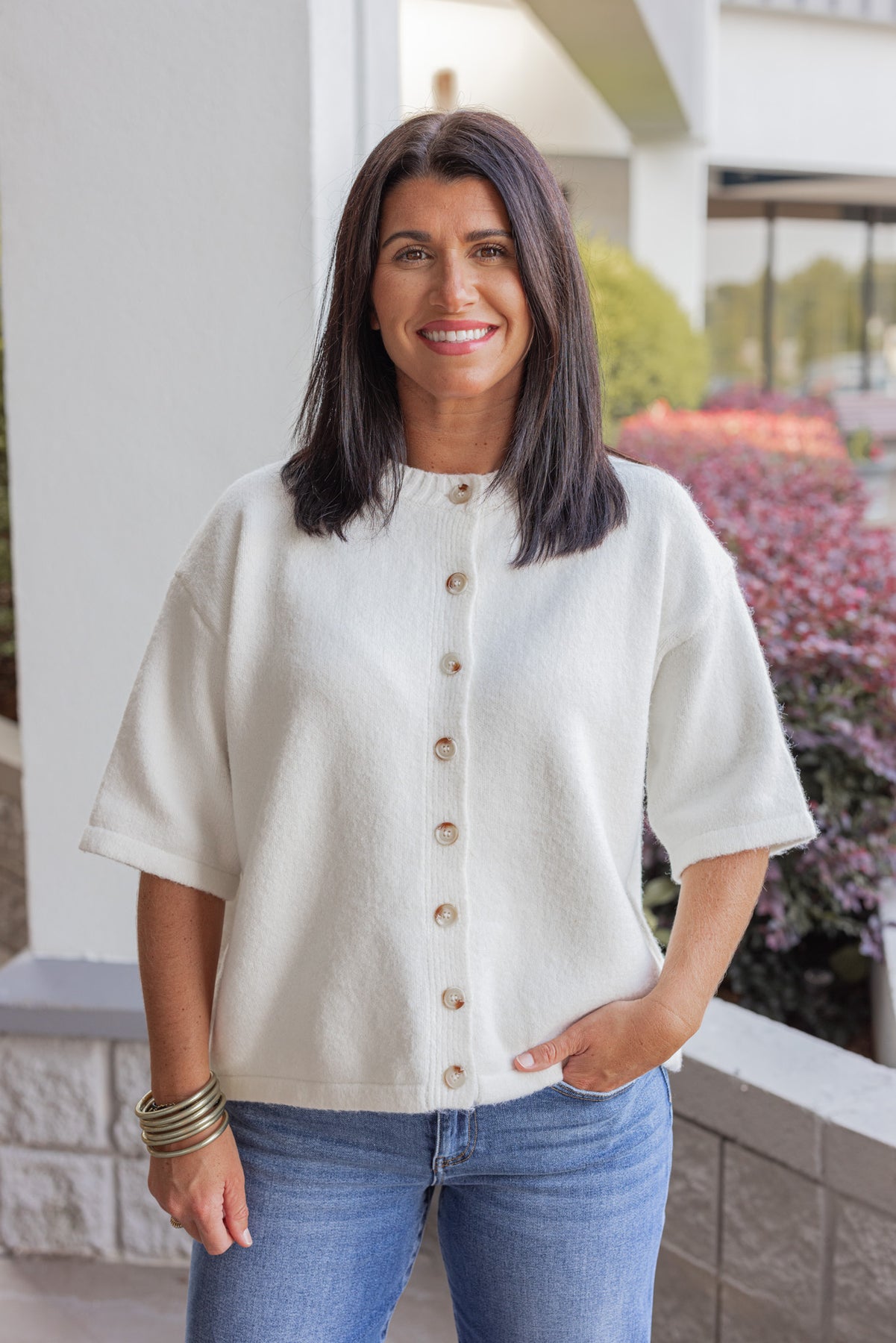 Jump on the cozy trend with this adorable knit top! Featuring brushed knit fabric in off white, with a button front closure, and comfy 1/2 length sleeves. The ideal top for the upcoming seasons, whether worn casually with sneakers or dressed up with a skirt and boots - perfect buttoned up, or left open as a layering piece!