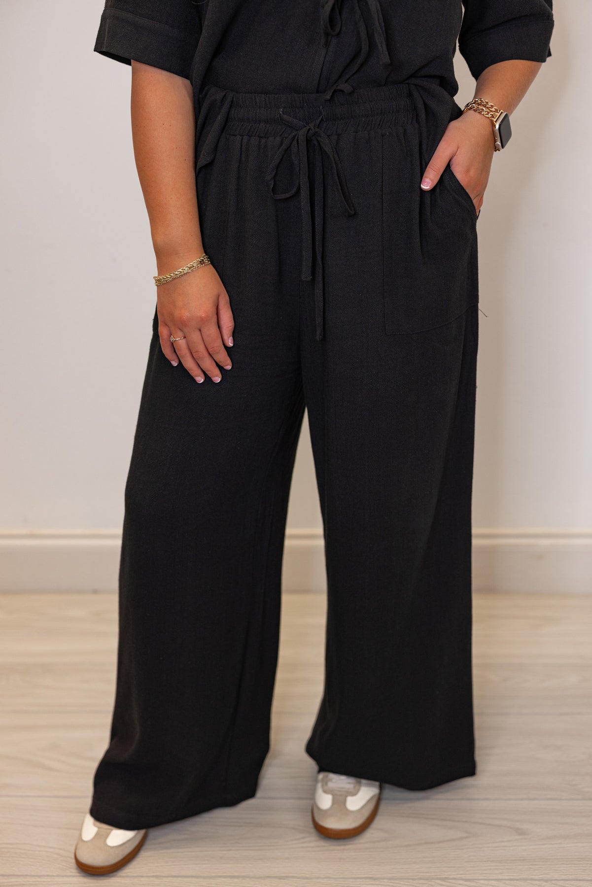 Women's black linen bow tie top and elastic waist wide leg pants set by Jodifl   showing pants up close side view