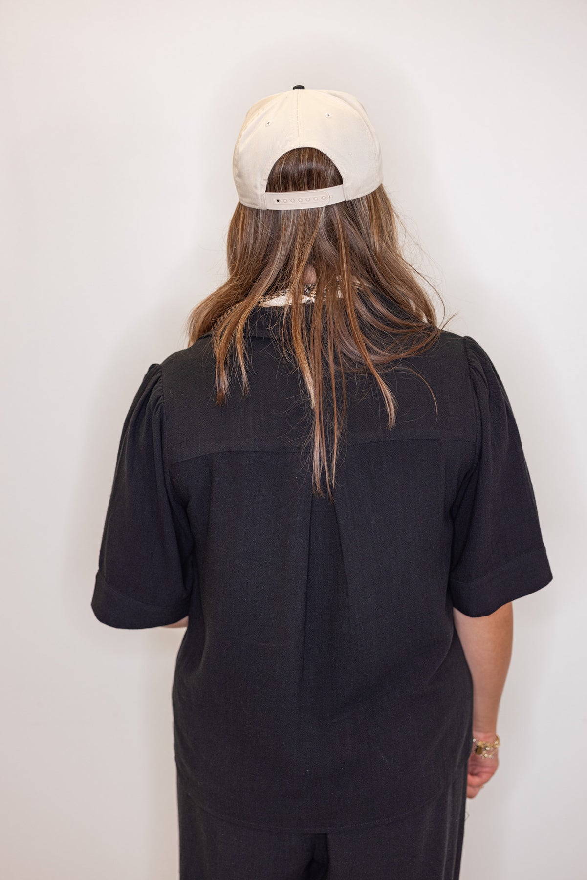 Women's black linen bow tie top and elastic waist wide leg pants set by Jodifl   showing tops relaxed silouhette