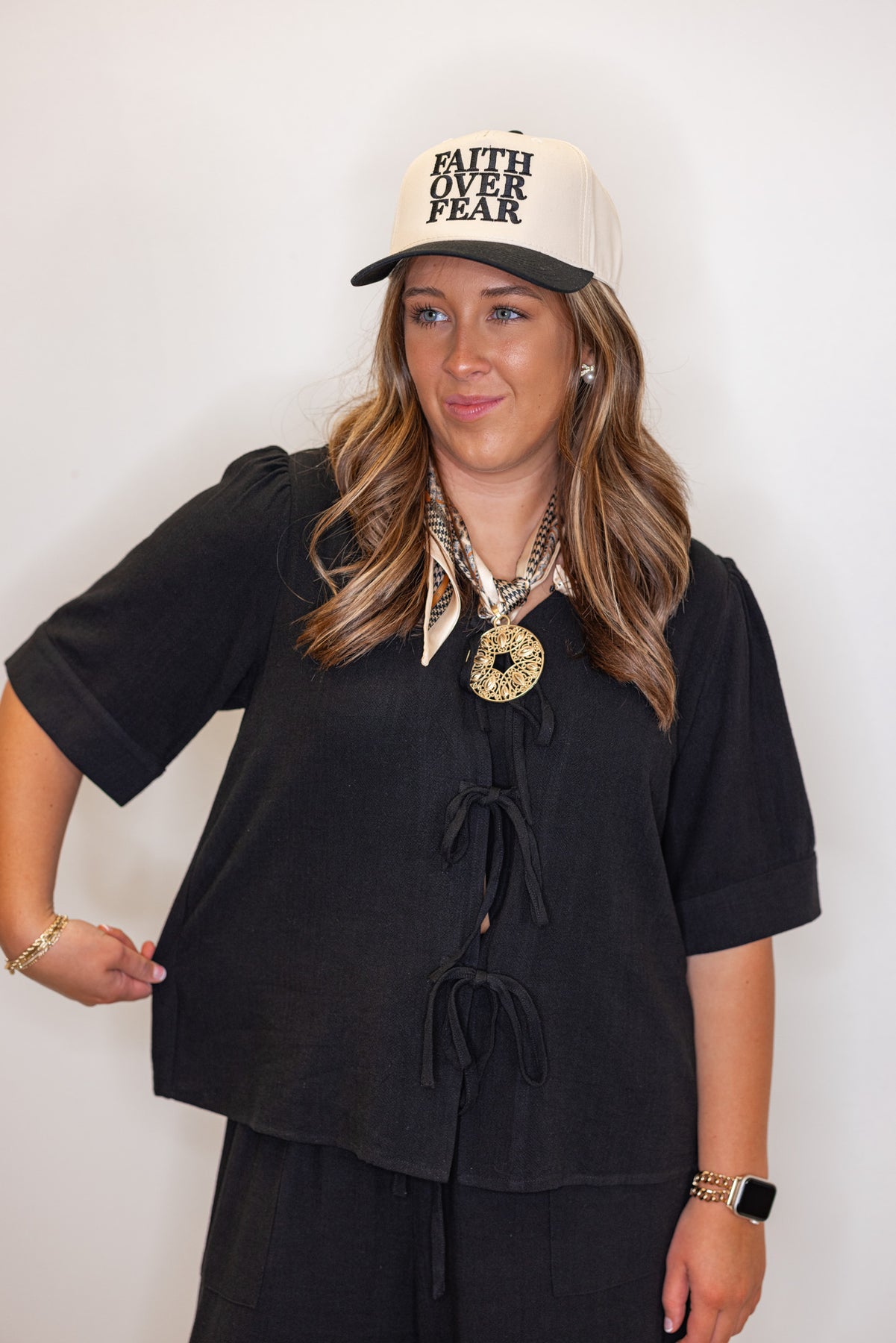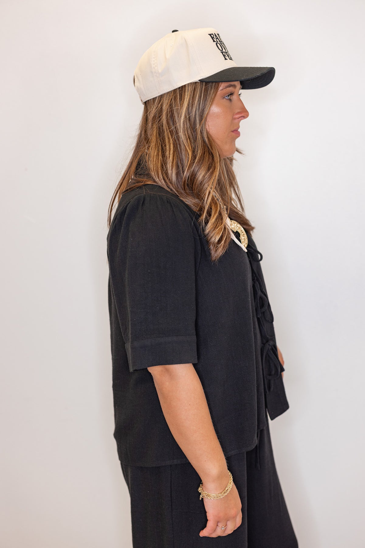 Women's black linen bow tie top and elastic waist wide leg pants set by Jodifl  showing up close front view of top