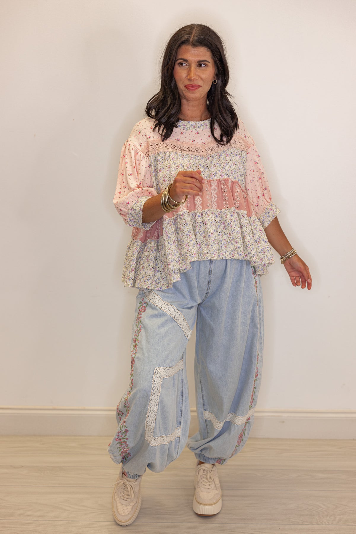 Embrace a playful vibe with this Perfect Patchwork Pink Floral Top, featuring a charming mix of pink and ivory fabric with multicolor floral prints. Delicate embroidery and eyelet details add a touch of whimsy, while ruffle tiers and puff sleeves bring flirty volume and movement. Shop the look: Pants | Sneakers
