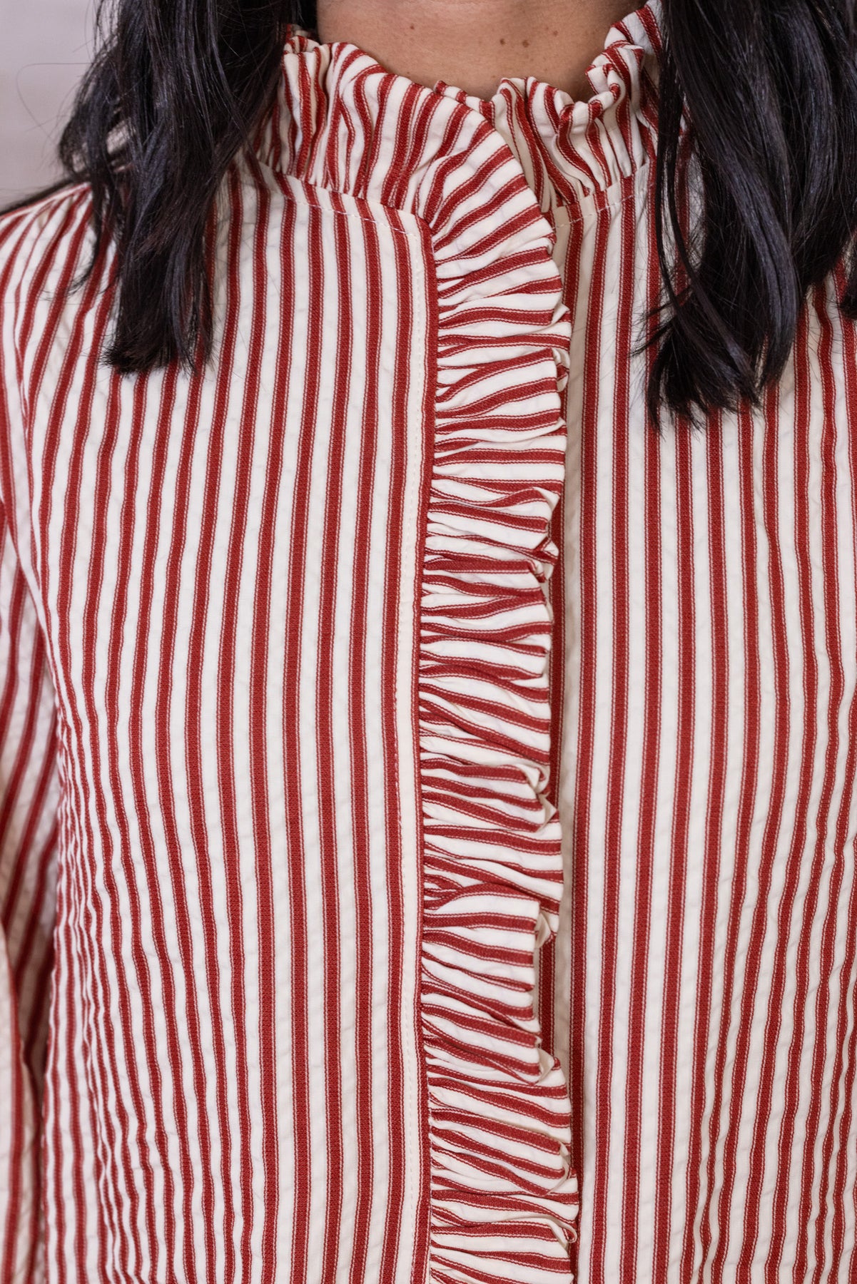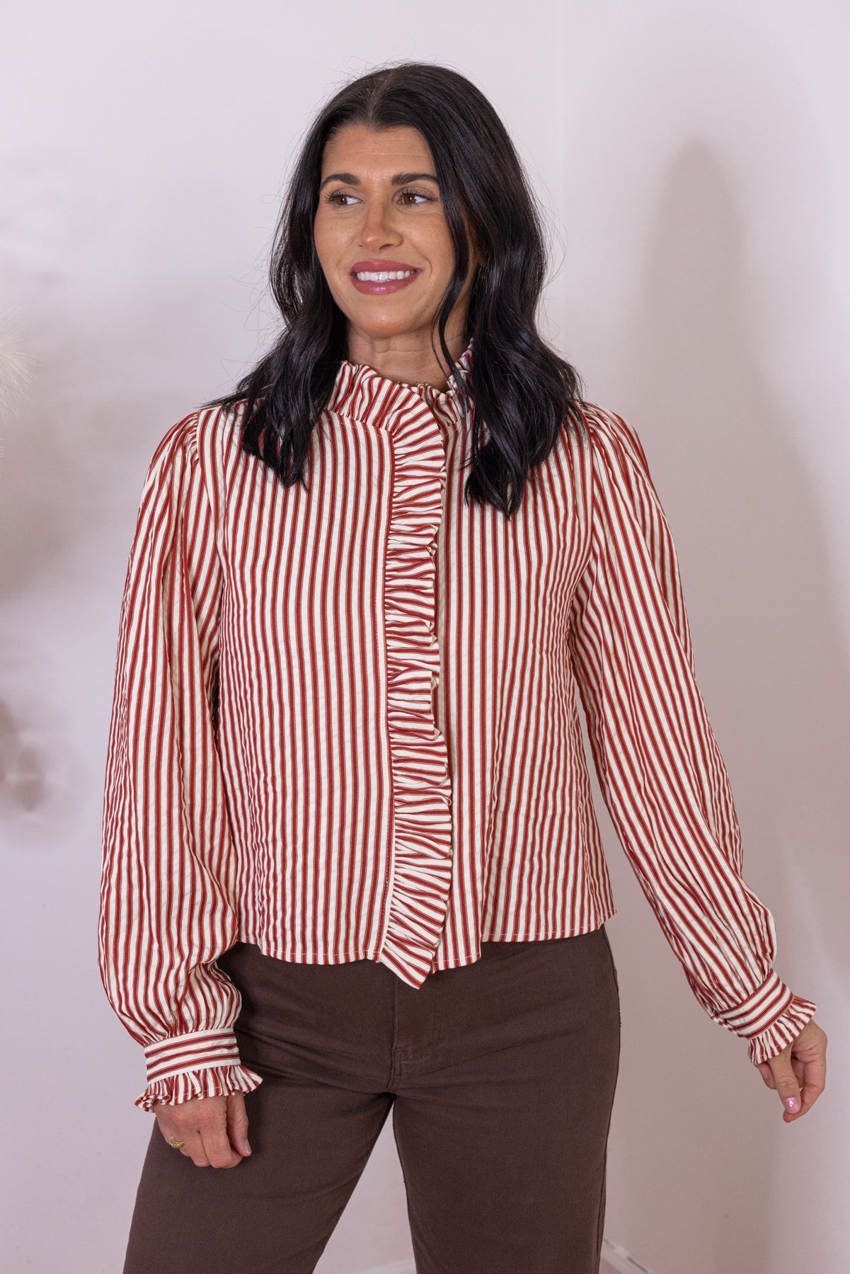 Stripes meet ruffles in this delightfully dramatic top! Featuring a chic marsala and cream striped textured fabric, this piece brings serious personality to your wardrobe. The mock neck is trimmed with a playful ruffle which flows down the center hiding a button front closure. Long balloon sleeves with button cuffs and ruffled edges add a touch of whimsy and movement. Perfect for anyone who believes more ruffles equals more fun! Shop the look: Brown Ruffle Jeans
