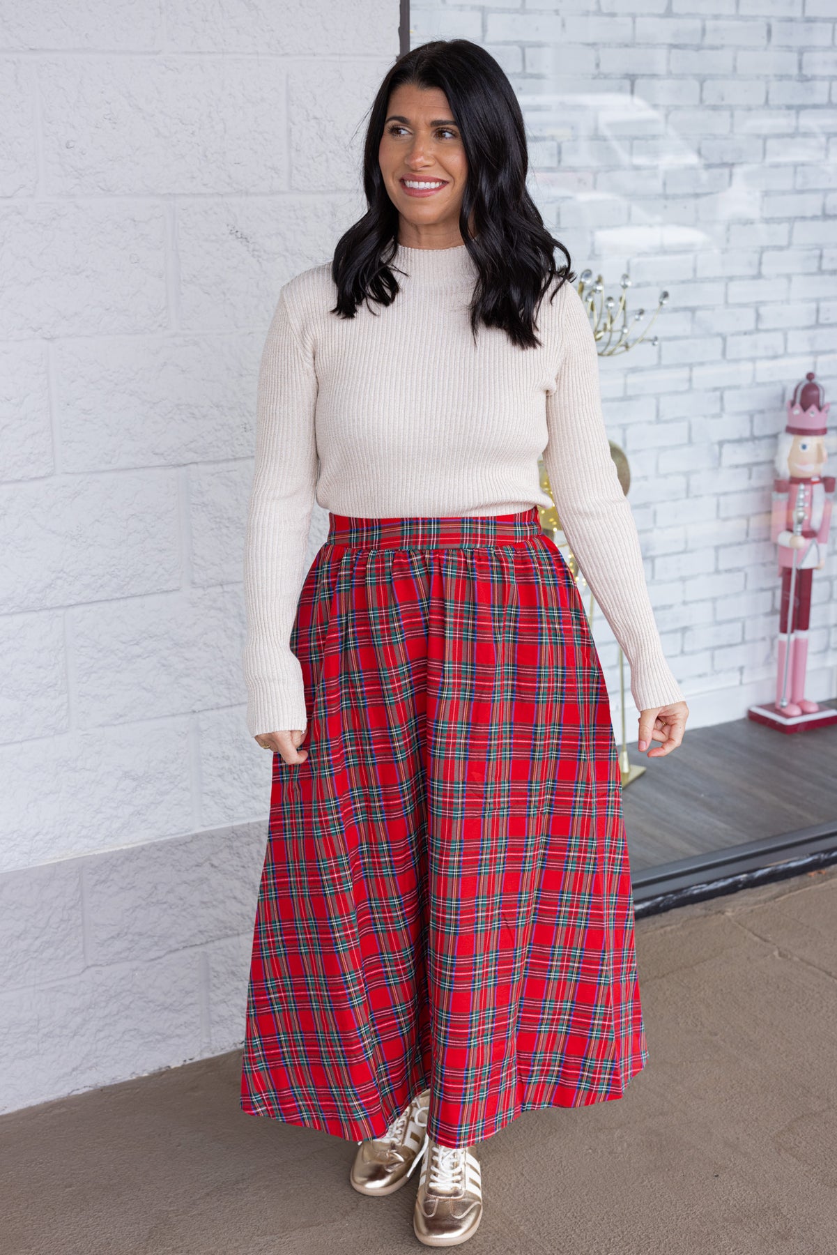 Elevate your sparkle game with this champagne ribbed knit top that's basically liquid glamour in fabric form! The metallic gold glitter details catch the light, while the mock neck and long sleeves keep things chic and put-together. Perfect for nights when you want to shine brighter than your confidence. Layer it, style it solo, or let it be the star of the show — this top is ready for whatever sass you're serving! Shop the look: Red Plaid Skirt