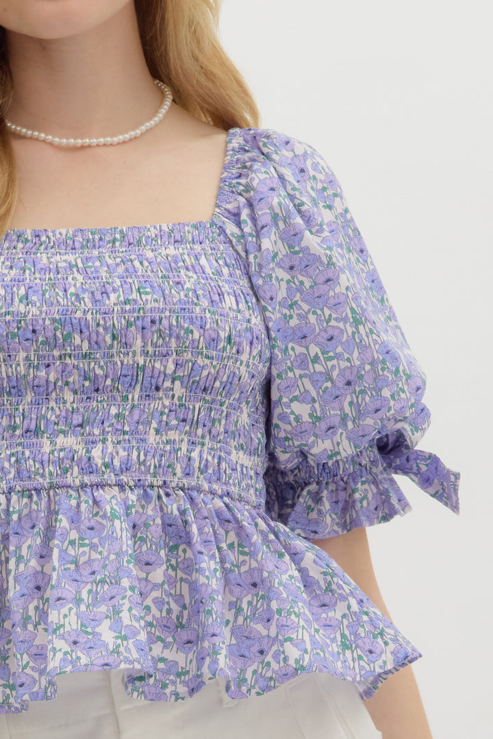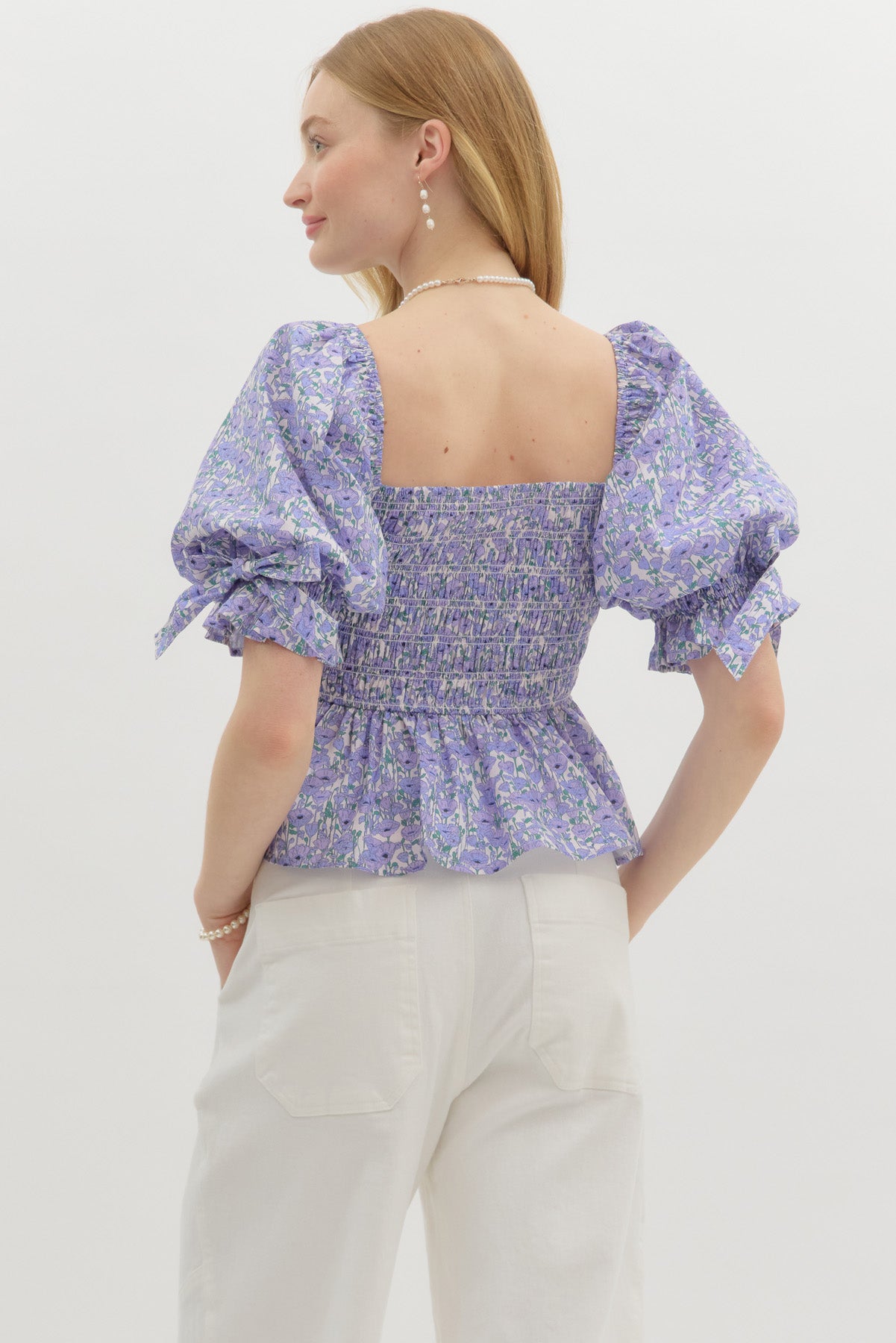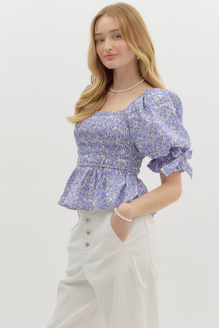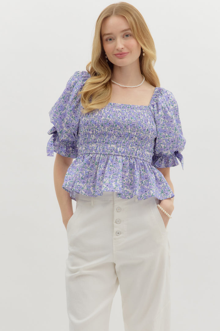 Add a pop of color with our Summer Bouquet Lavender Peplum Top! Featuring a beautiful lavender and purple floral print on cream fabric, a smocked bodice, and short puff sleeves, this top is both stylish and comfortable. Perfect for picnics and sunny days, it's a must-have for any wardrobe!