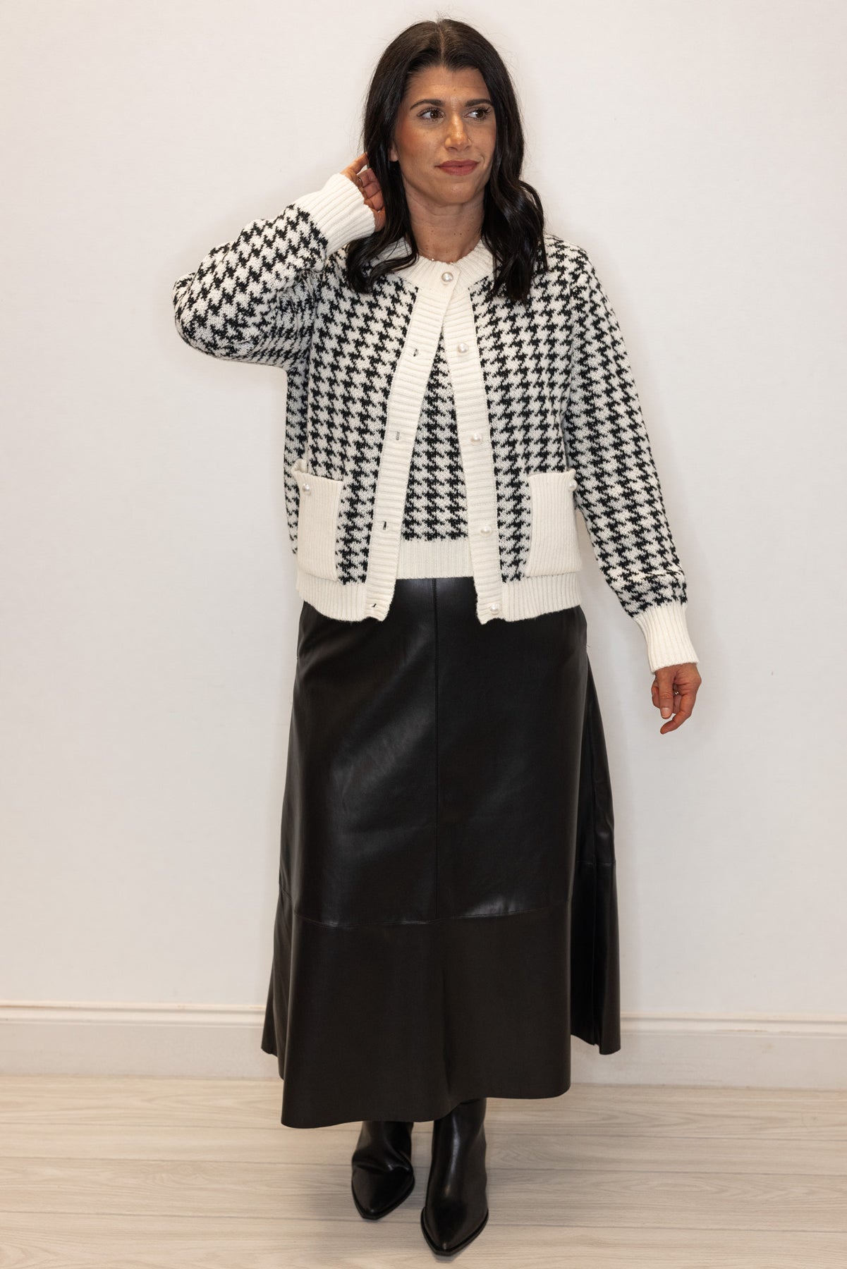 Channel your inner icon with this chic houndstooth set inspired by timeless elegance! The black and ivory knit tank pairs perfectly with the matching button-front cardigan adorned with lustrous pearl buttons—a nod to classic sophistication. Wear each piece solo, or layer them up for effortless style that whispers old-money charm. Perfect for anyone who appreciates a touch of vintage glamour with modern versatility! Shop the look: Black Faux Leather Skirt