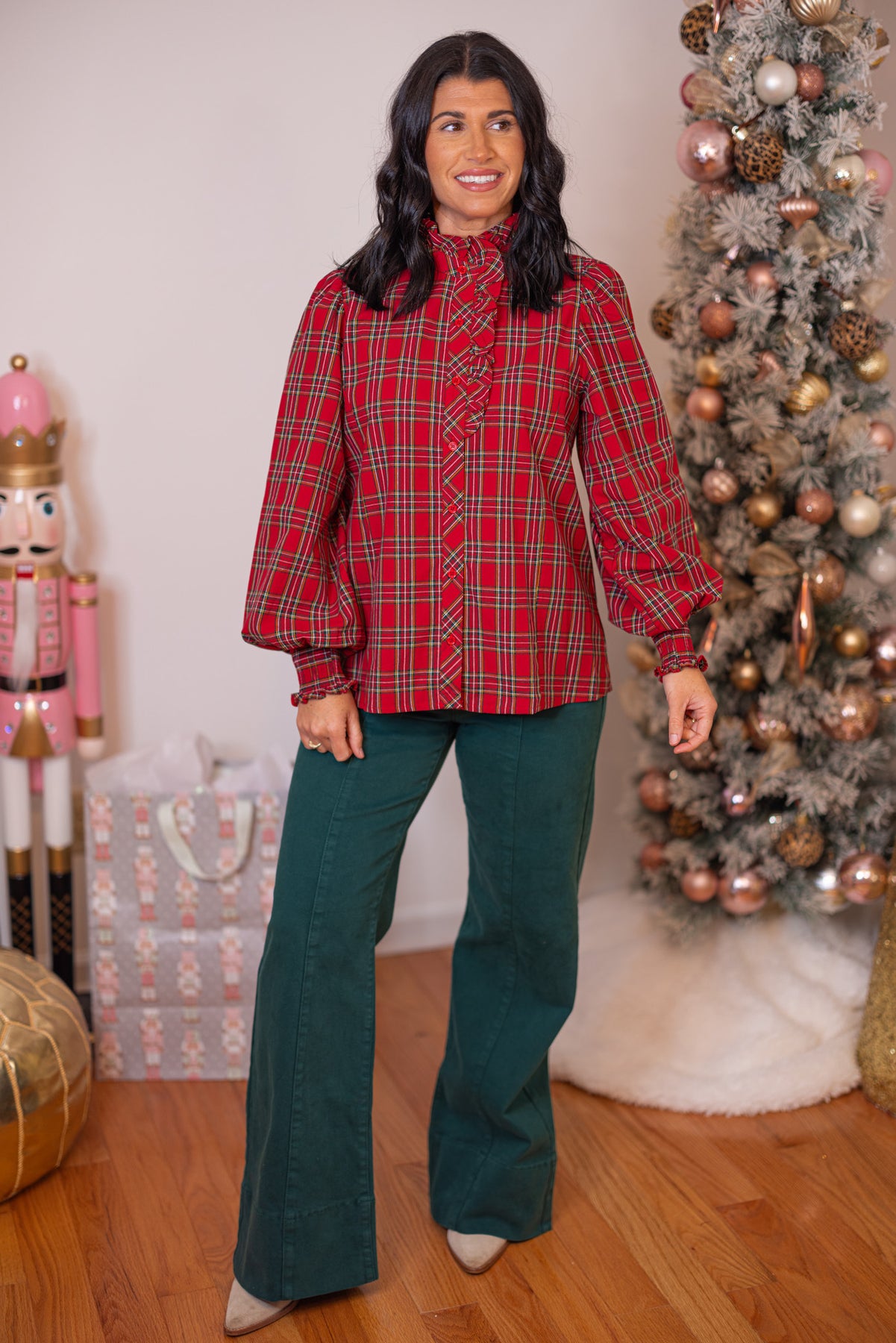 Embrace vintage charm with this red plaid button front top featuring playful green print! The ruffle details around the mock neck and down the bodice add a flirty touch, while the smocked cuffs and long balloon sleeves offer a fun, comfy fit. Perfect for adding a unique twist to any outfit! Shop the look: Dark Green Risen Wide Leg Jeans