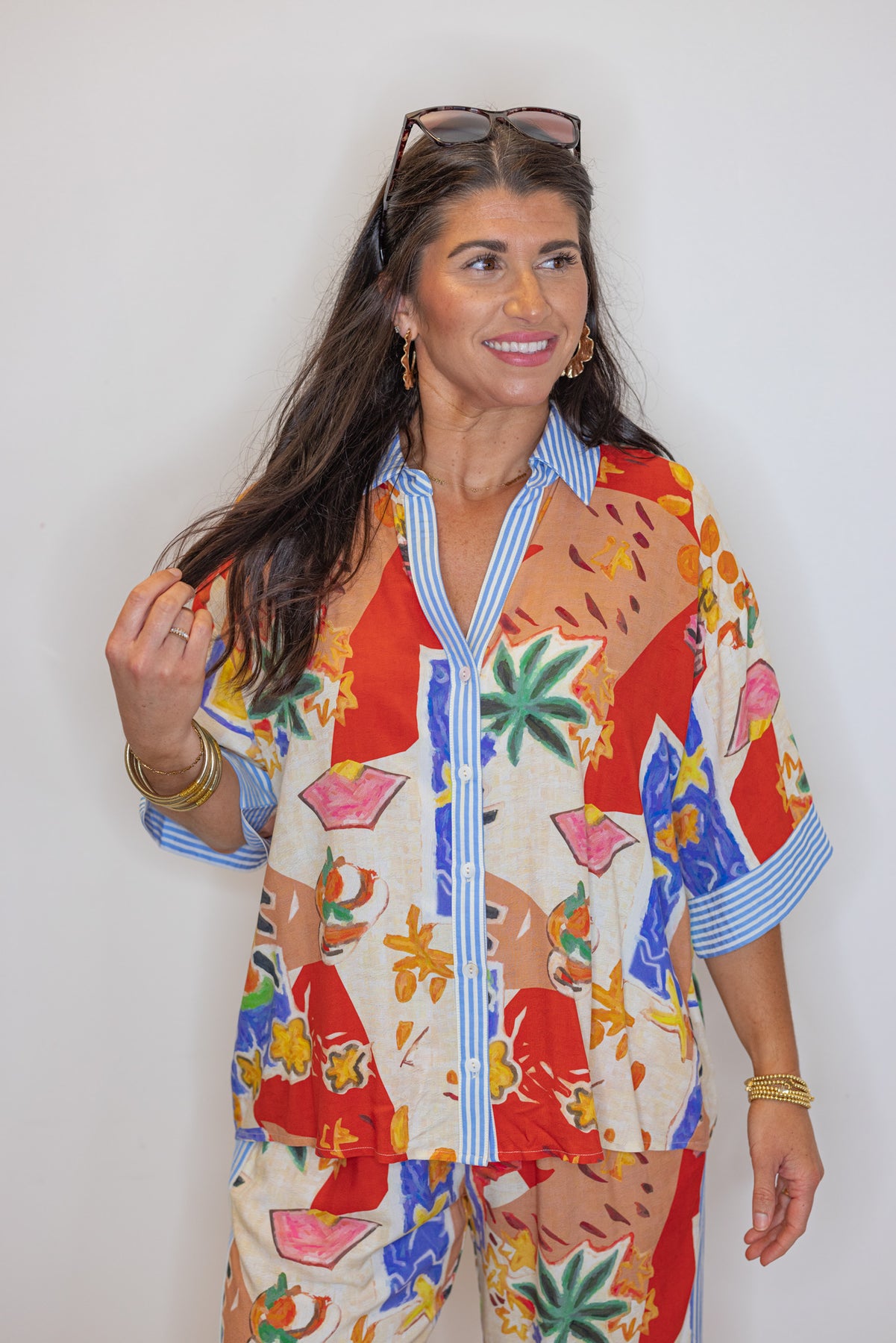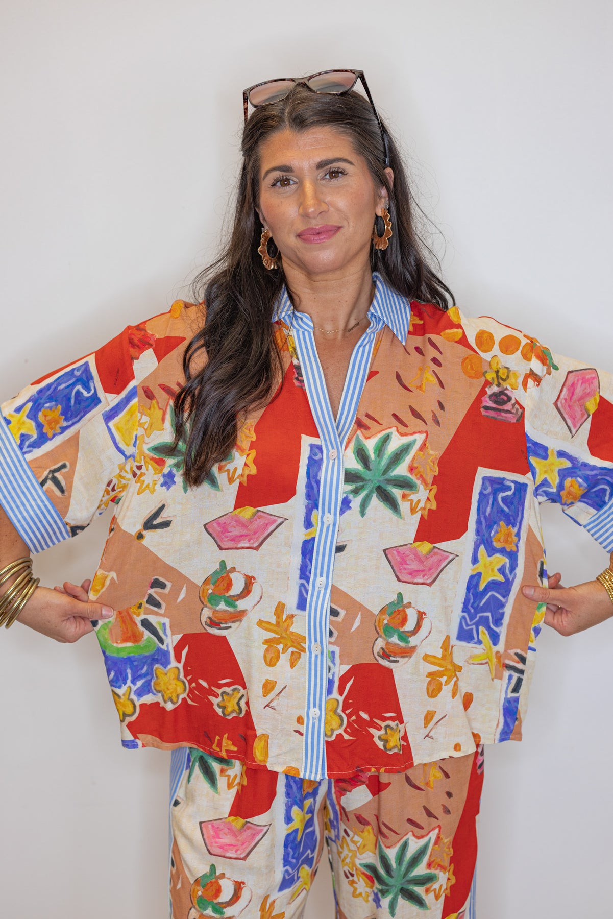 Get ready to dream in color with our Abstract Dreaming Cream Multicolor Top! Featuring a cream multicolor bold abstract print with blue and white trim, this button down top is sure to make a statement. Perfect for adding a pop of color to any day out! Shop the matching pants here for the dreamiest outfit around!