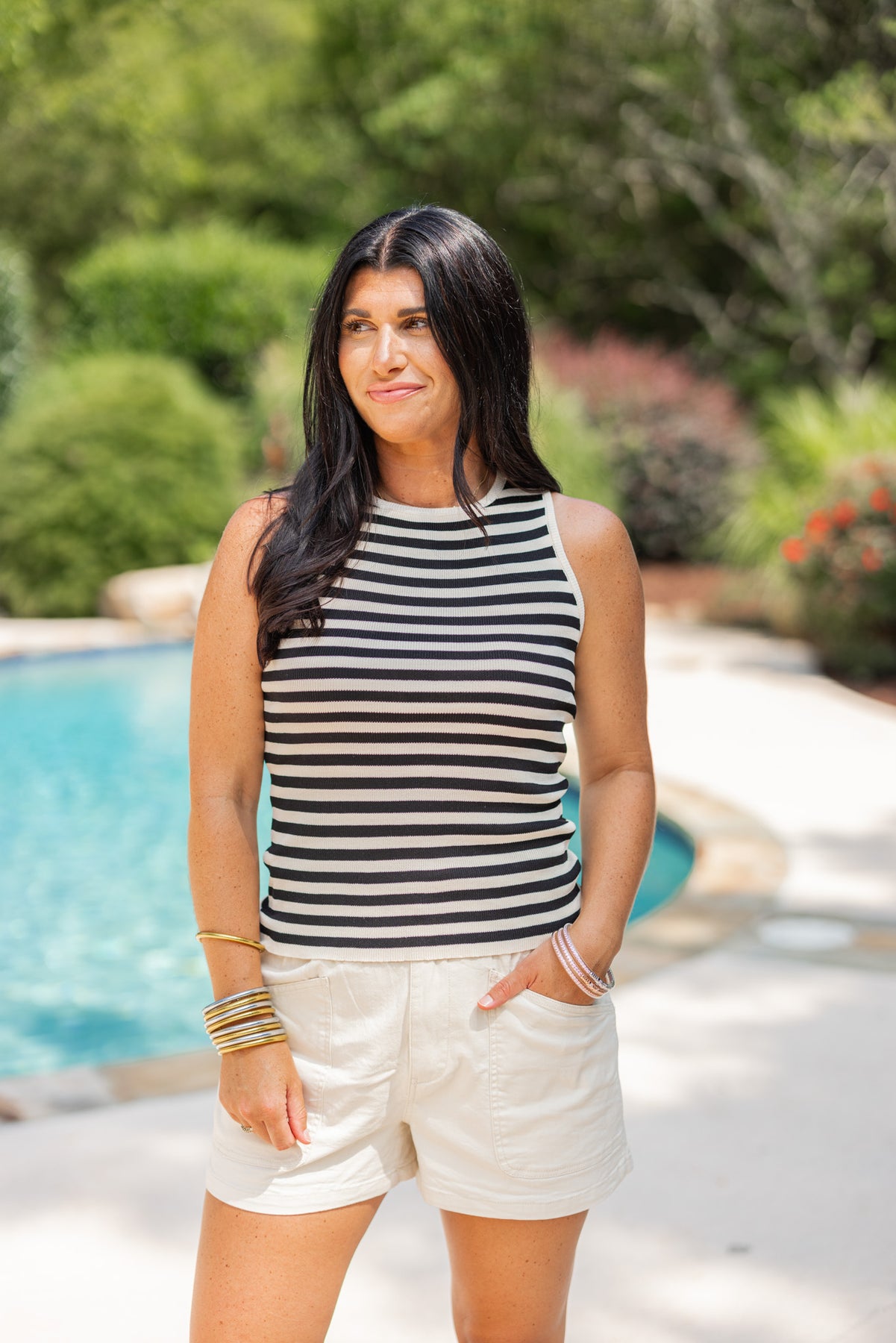 Introducing this Summer's new trending top: Summer Anthem! Soft knit fabric in a sleeveless style with black and taupe stripes, and a crew neckline. She's the perfect top this season for all of your festivities! Shop the look: Shorts