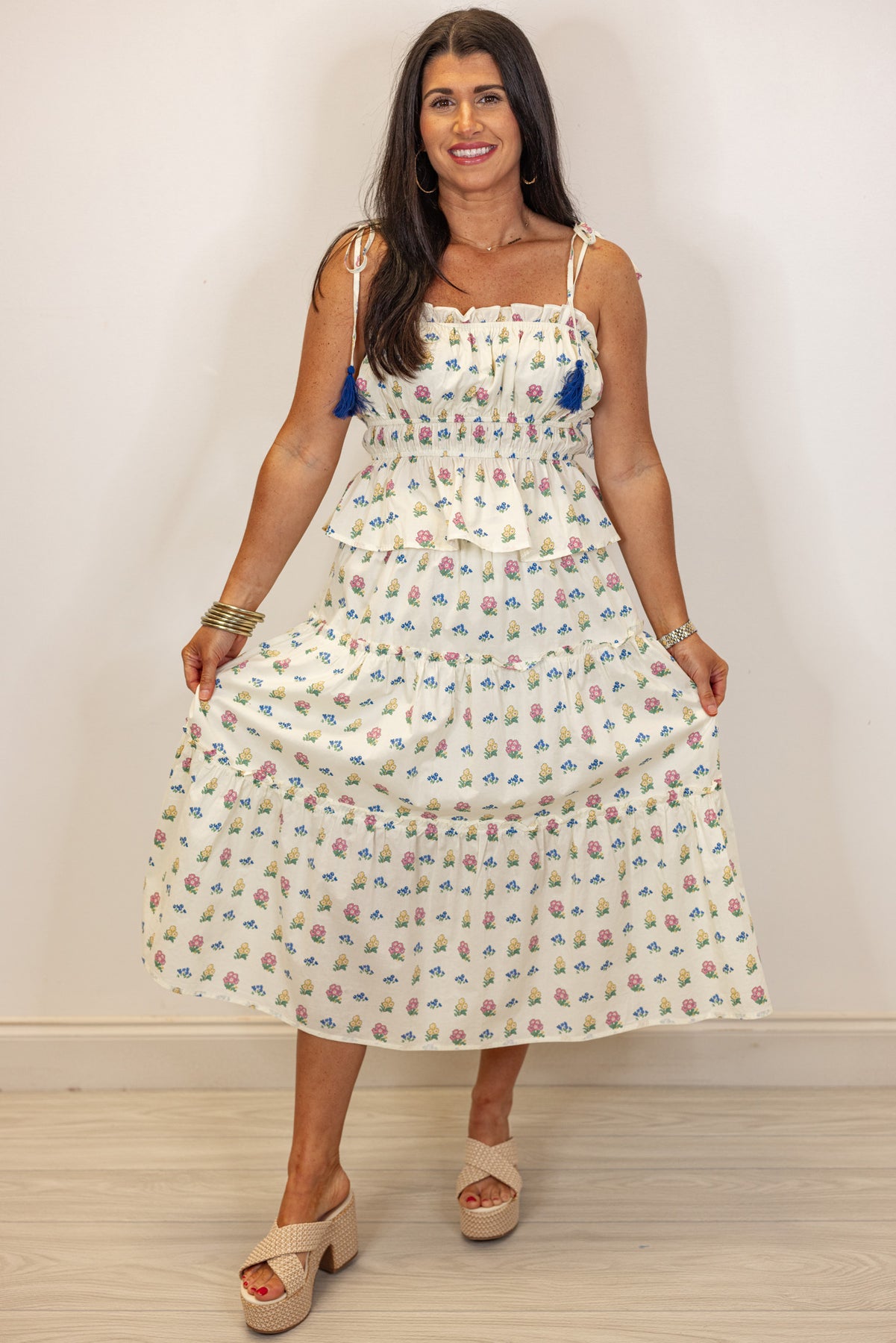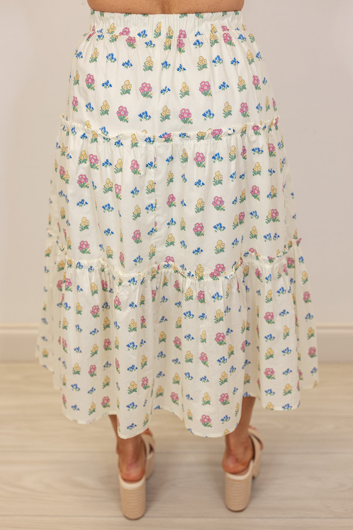 Get ready to bloom in style with our Blooming Inspiration Cream Midi Skirt! Made with a lovely cream fabric, featuring a whimsical blue, pink, and yellow floral print. The elastic waistband ensures comfort and the ruffled tiers add a touch of elegance. Shop the matching top here for the prettiest floral outfit - perfect for any occasion!