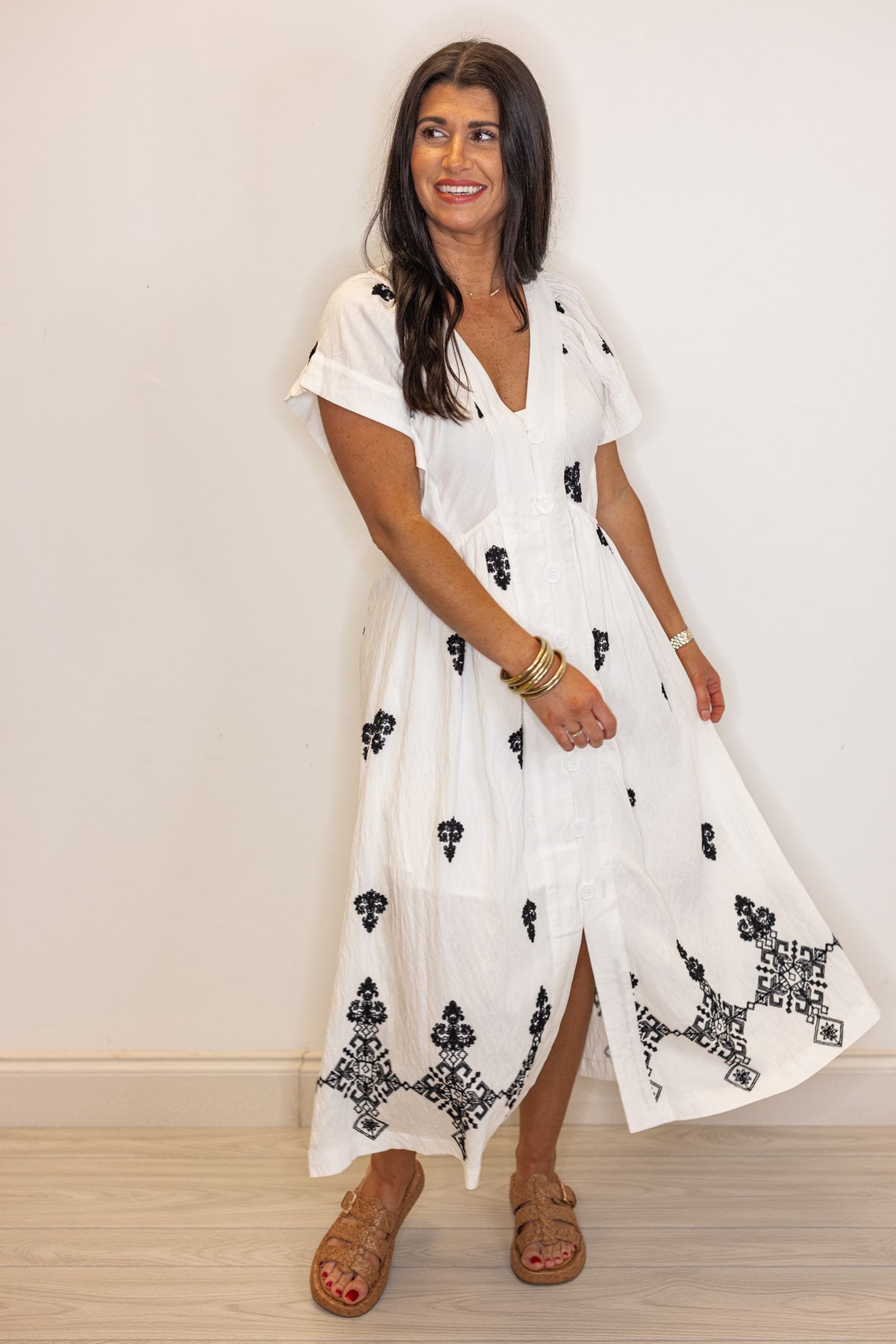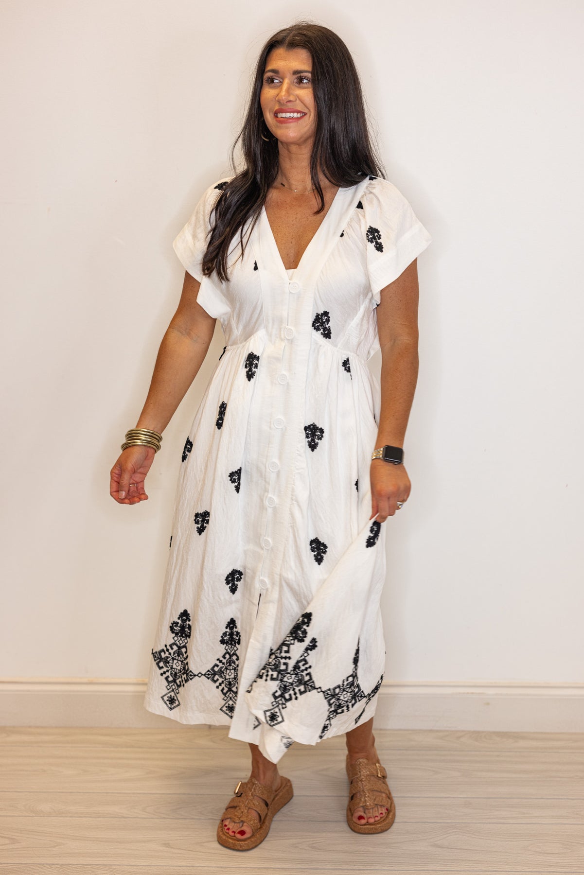 Show off your unique style with our Embroidered Aztec Off White Midi Dress! Made with a stunning embroidered black Aztec print on off white fabric, this dress features a button front closure and a flattering v neckline. Dolman short sleeves add a touch of playful charm. Bring your fashion game to the next level with this adorable dress!