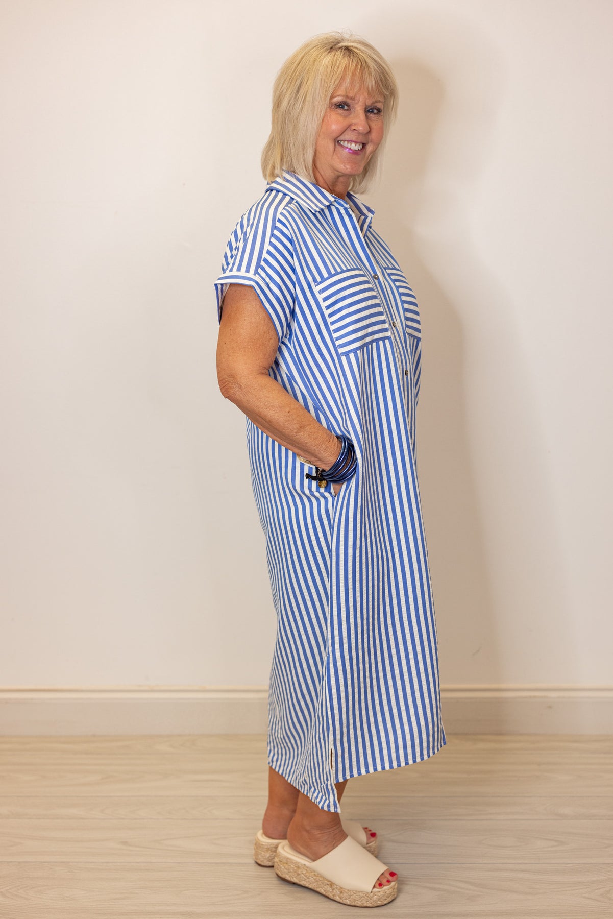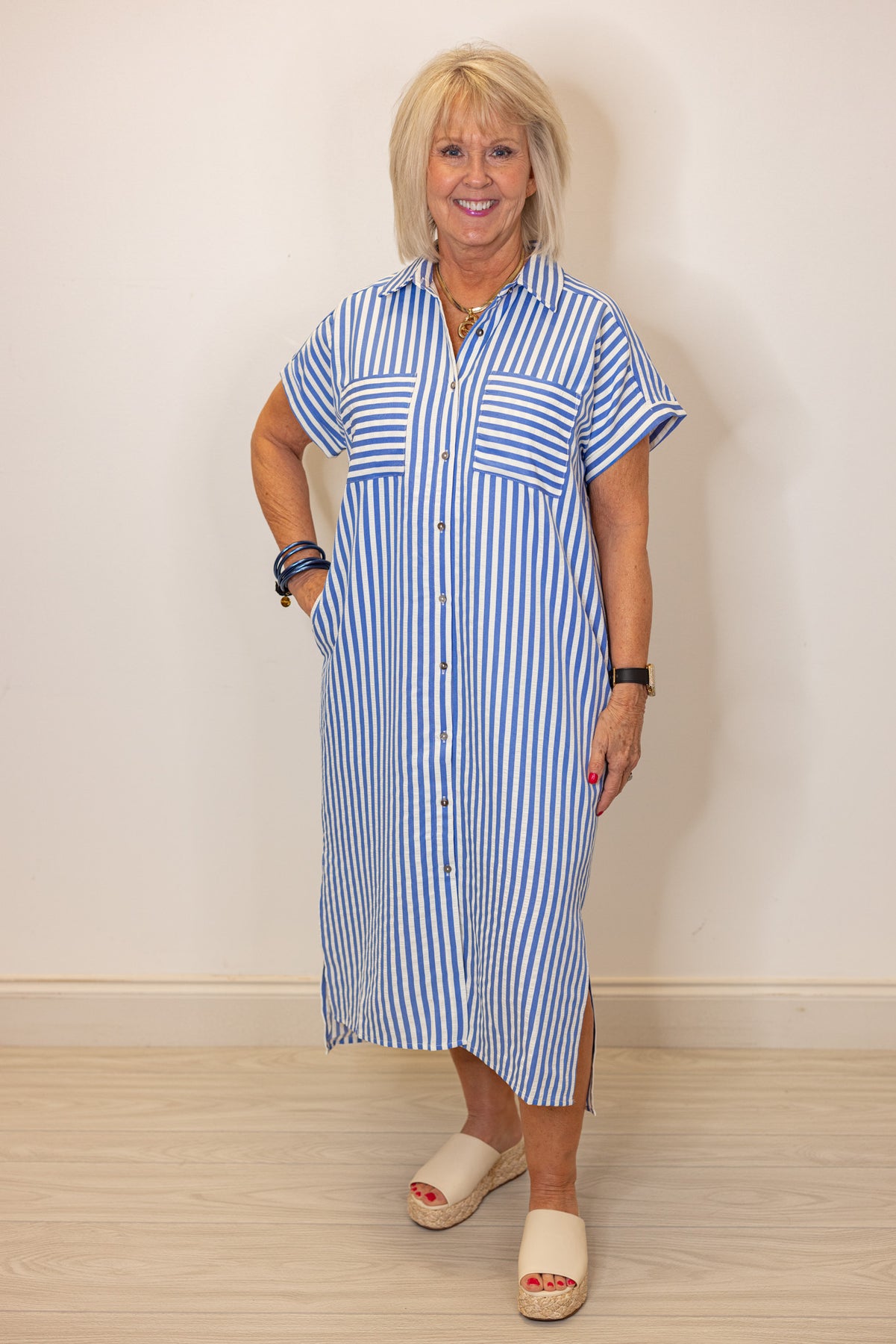 Get ready to turn heads this summer with our Stunningly Striped Blue Maxi Dress! Perfect for any occasion, this dress features a vibrant and eye-catching blue color that is sure to make a statement and a classic collared front button closure.Stay stylish and cool in this must-have summer dress.