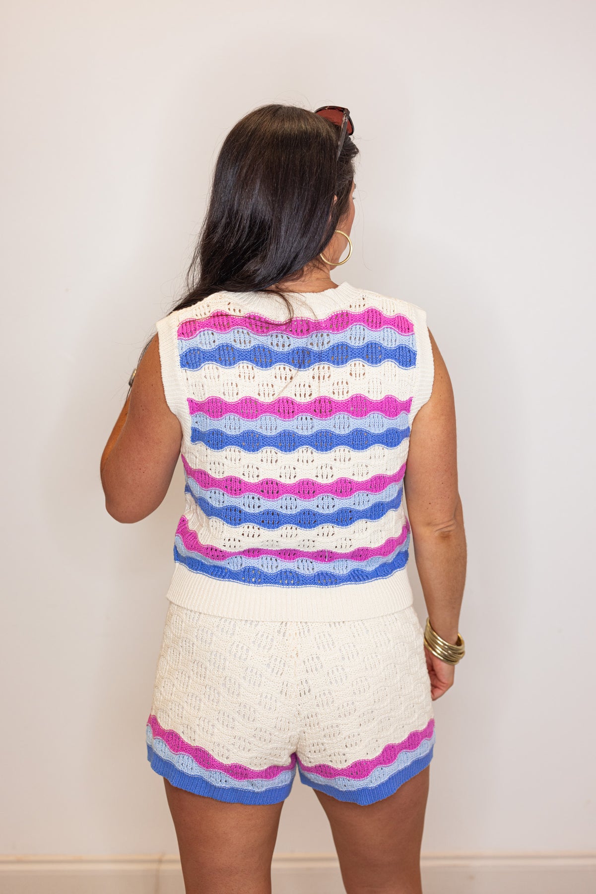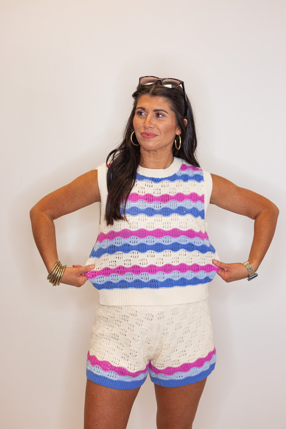 Get ready to make a splash in this Wavy Crochet Blue Stripe Top! Made from ivory crochet knit, this top features playful waves of dark blue, light blue, and pink, perfect for adding a pop of color to your summer wardrobe. With a crew neckline and sleeveless design, this babe is both stylish and comfortable. Grab the matching shorts here for the trendiest outfit of the season!