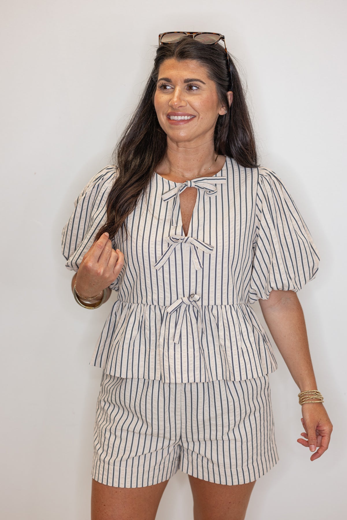 Get ready to strut your stuff in the Perfect Stripes Ecru Textured Shorts! Made with textured ecru fabric and accented with navy stripes, these shorts are super cute and trendy. Featuring an elastic waistband with drawstring and front pockets. So adorable! Shop the matching top here for an adorable striped outfit that's perfect for any occasion!