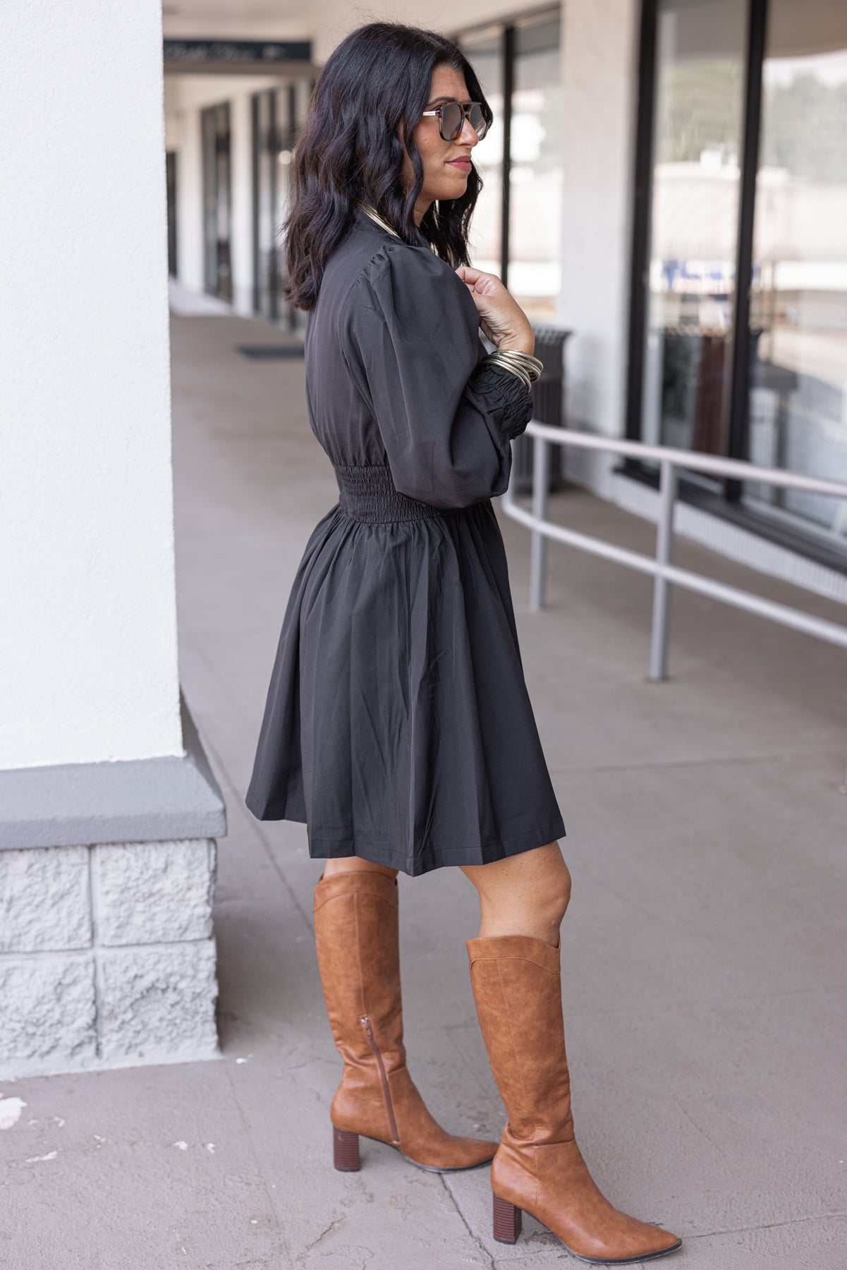 Step out in style with this Zipped Up Little Black Dress featuring a sleek black fabric and a zipper front closure with a flirty V neckline. The smocked waistband adds a flattering shape, while the long balloon sleeves bring a fun, playful twist. Perfect for turning heads wherever you go!