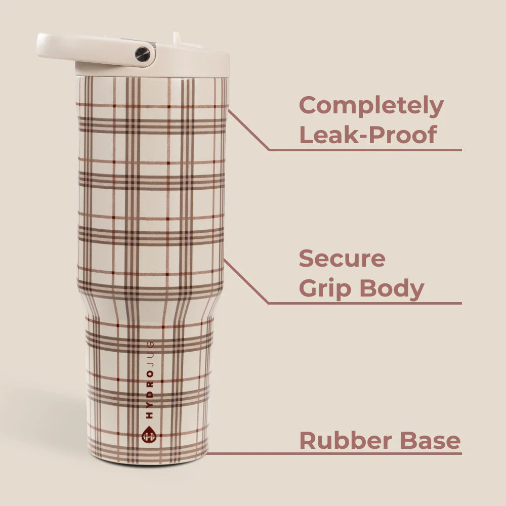 The HydroJug Sport 40oz in Blair combines maximum hydration with timeless, everyday style. Its cream base wrapped in clean brown plaid lines makes it a versatile companion that looks just as good at the gym as it does on your commute or desk. With a 40oz capacity, Blair keeps you hydrated longer with fewer refills, making it an ideal choice for long training sessions, busy workdays, and outdoor adventures. Built from triple-layer insulated stainless steel, this Sport Bottle keeps drinks ice-cold for hours, helping you stay consistent with your hydration goals.