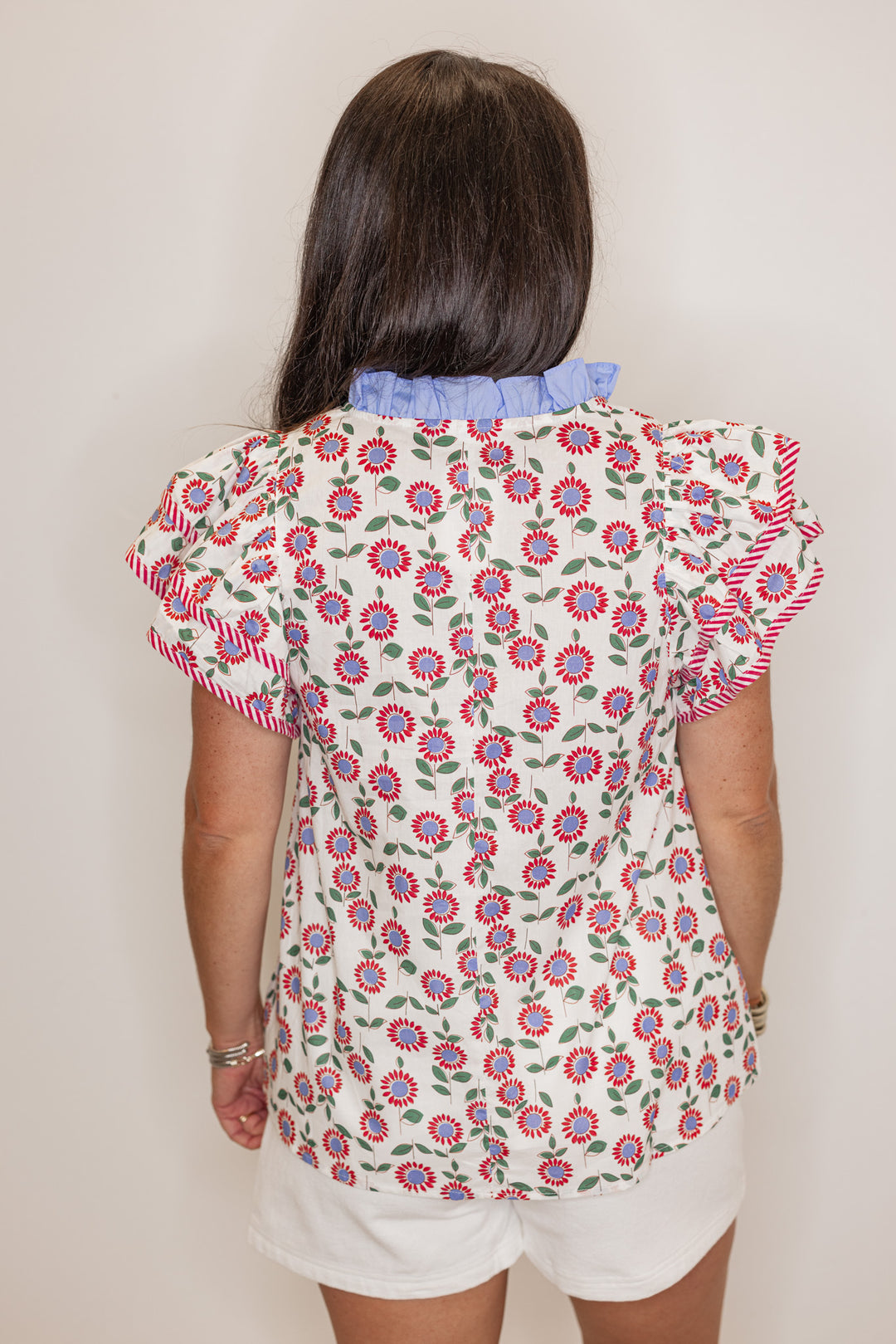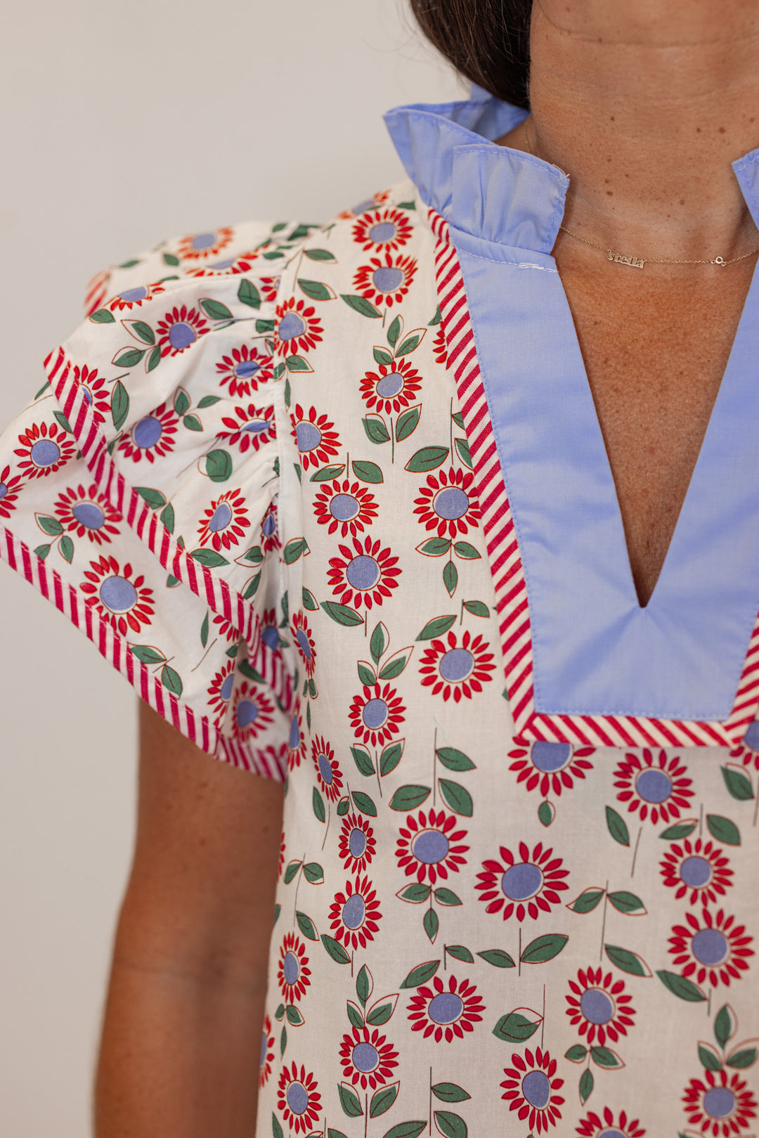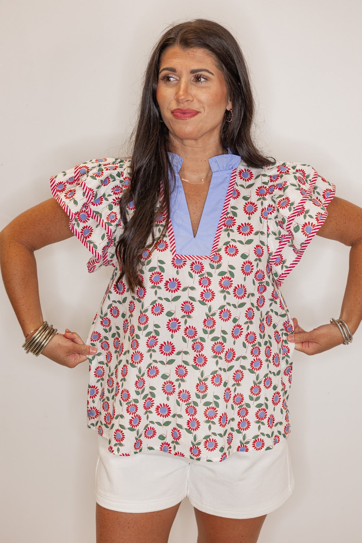 We have your new perfect Summer top! Introducing Floral Favorite, a cream poplin top with red, light blue and green floral print. Simple, yet beautiful! Featuring ruffle trim around the neck with a v cut neckline in blue, trimmed with red and cream stripes, and ruffle capped sleeves. This top will have you feeling flirty and stylish!