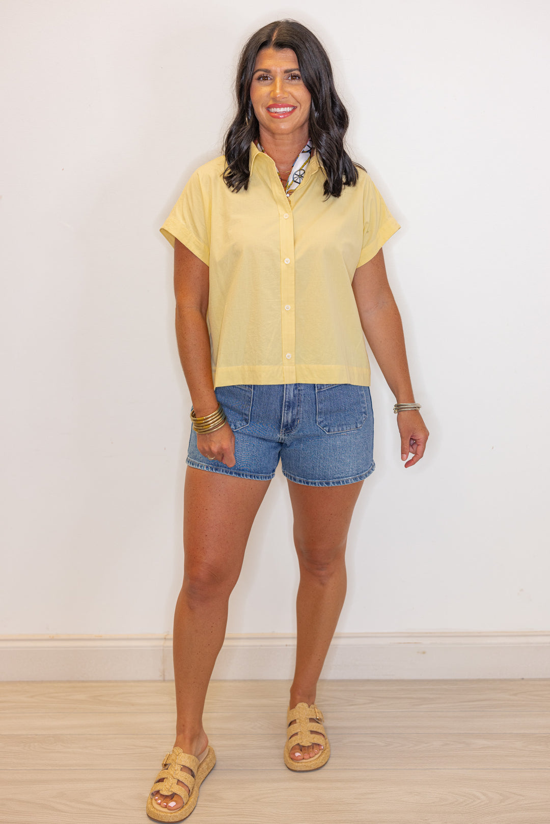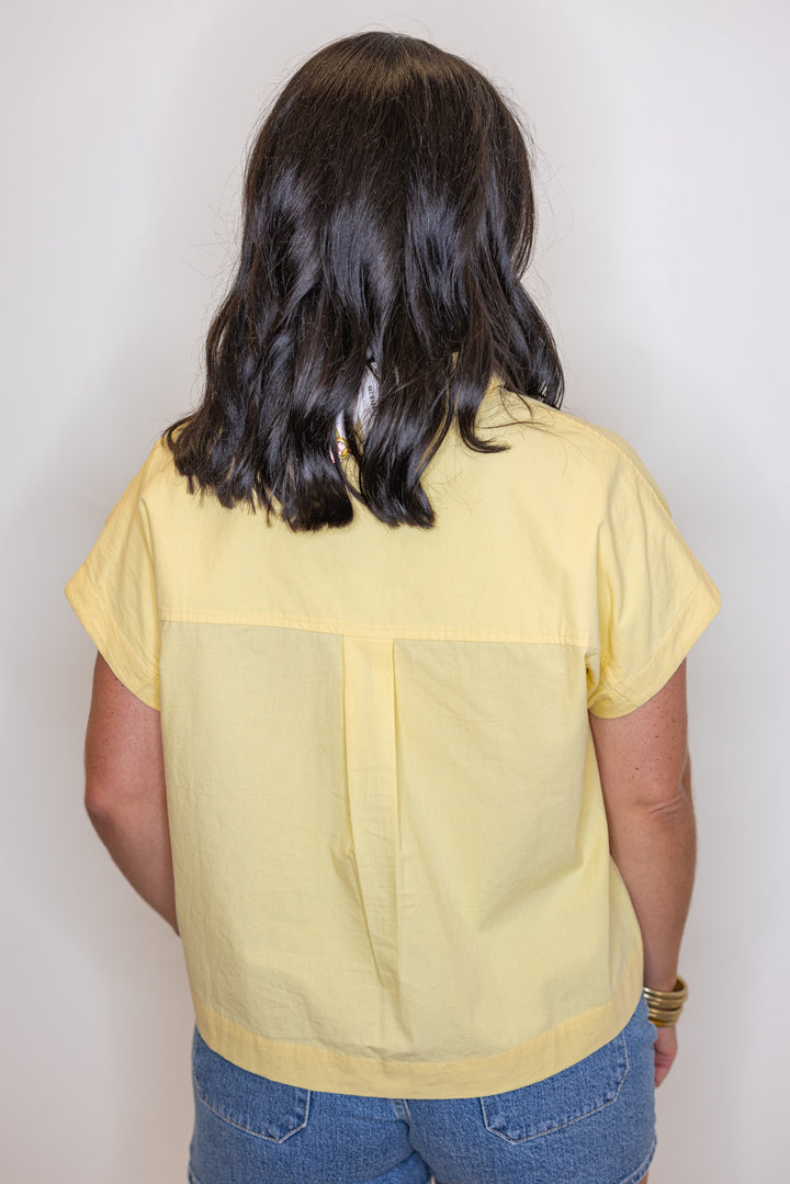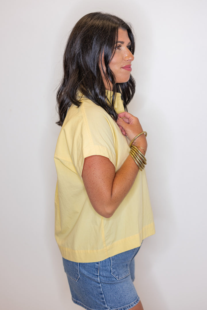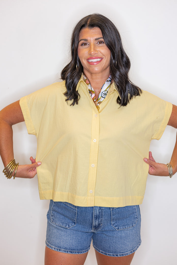 Stay cool and stylish in our Poplin Perfection Yellow Top! This breezy poplin top features a classic button down front with a collar, perfect for any casual occasion. Its short sleeves and semi-cropped design add a touch of playfulness to your outfit. A timeless closet staple!