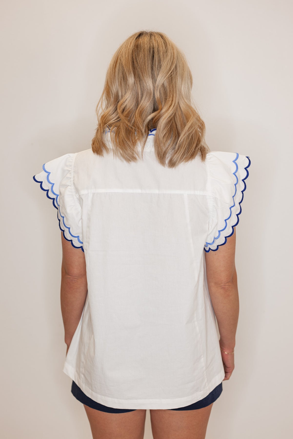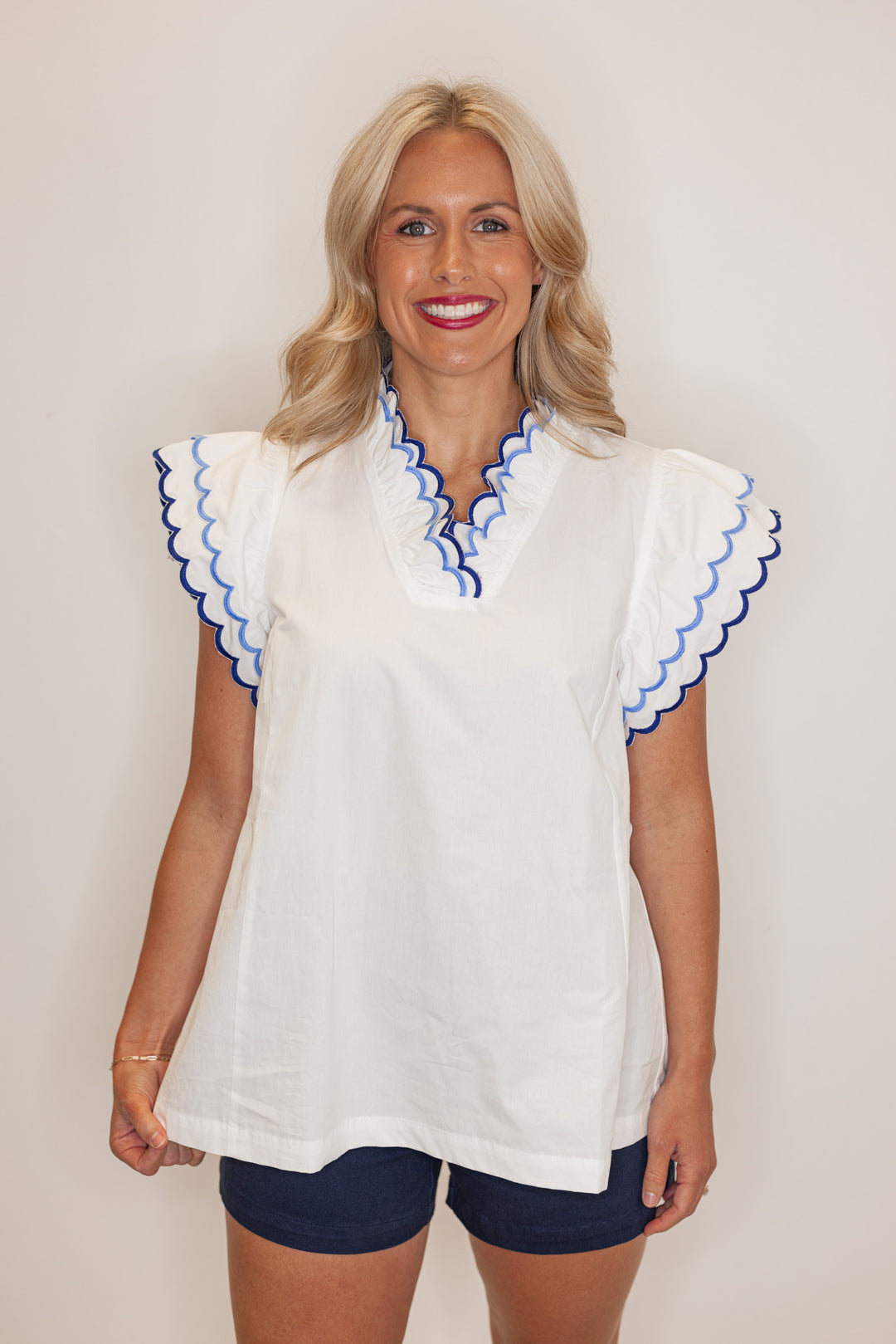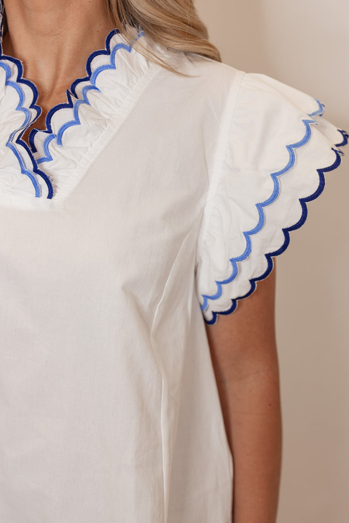 Get ready for summer with our Summer Waves Off White Top! Made from a cool off white poplin fabric, this top features a playful ruffle layered v neckline and ruffle layered sleeves, both outlined in blue and navy embroidered scalloped trim. Perfect for adding a touch of quirky charm to your summer wardrobe!