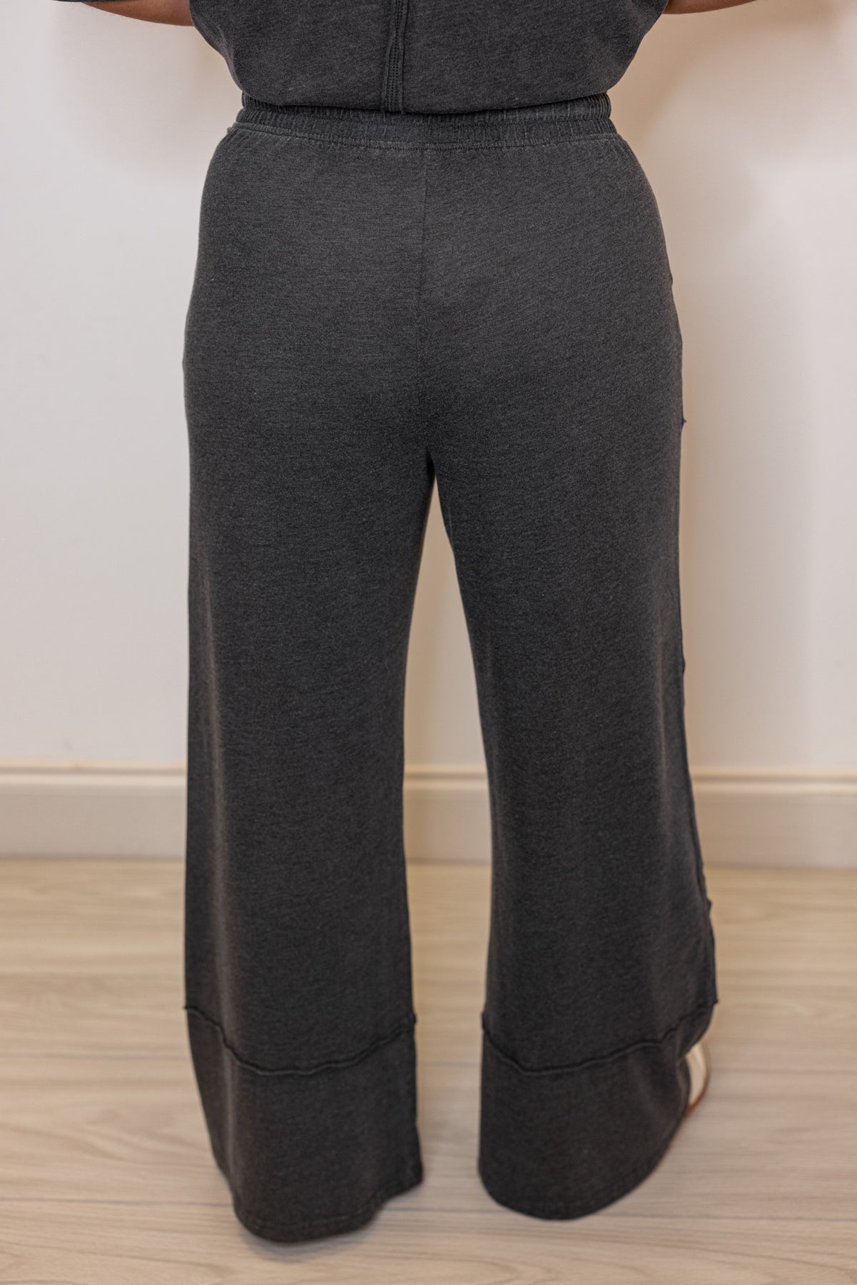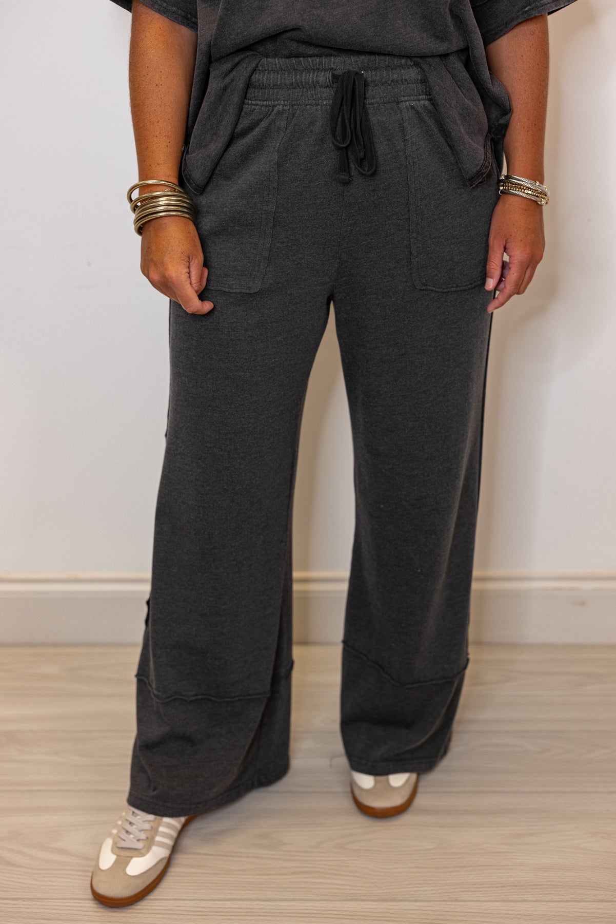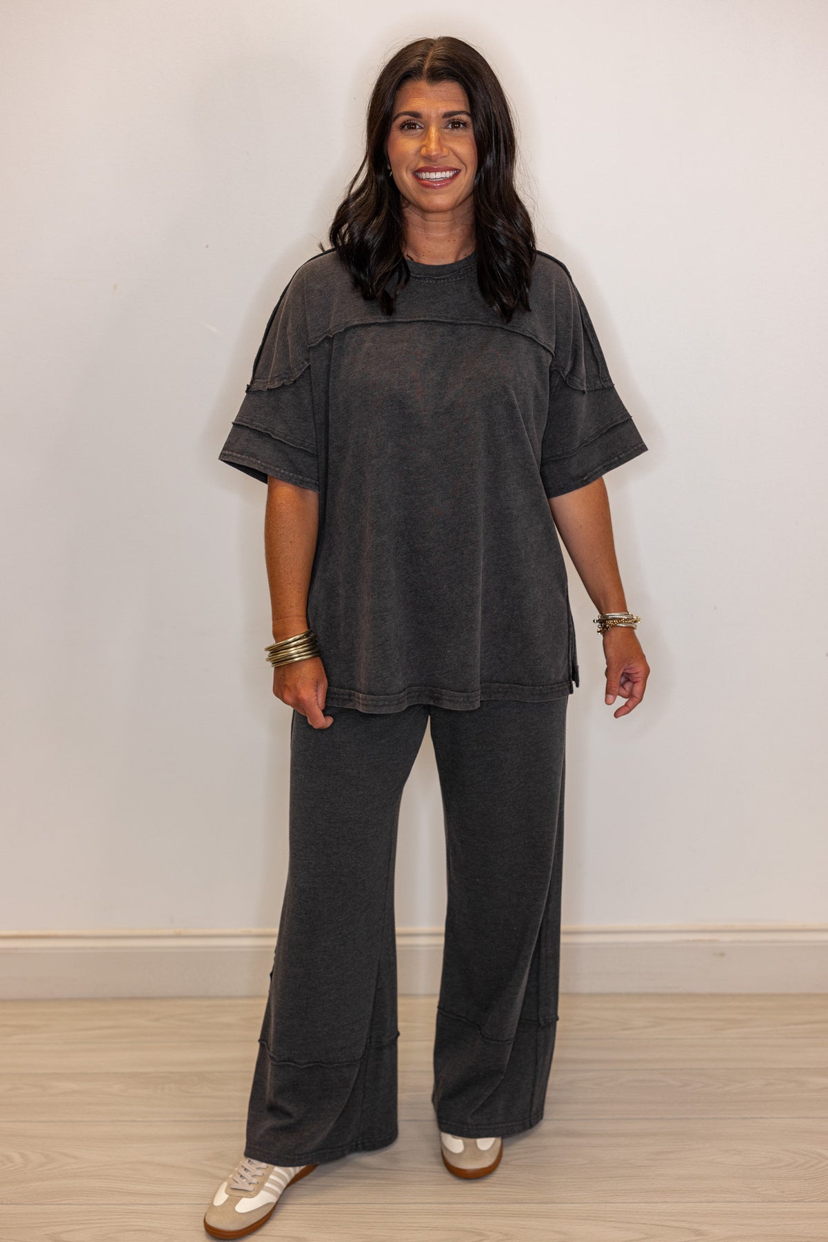 Get cozy and stylish in the Trending Vibes Black Pants Set, made from soft mineral-washed knit fabric. Featuring elastic waist pants with a drawstring for a comfy fit and handy front pockets, and matching top with a crew neckline and short sleeves. Both pieces boast eye-catching raw/reverse seam details, adding playful charm to your wardrobe. Get ready to embrace effortless cool vibes with this adorable outfit - ideal for those upcoming UGA gamedays!