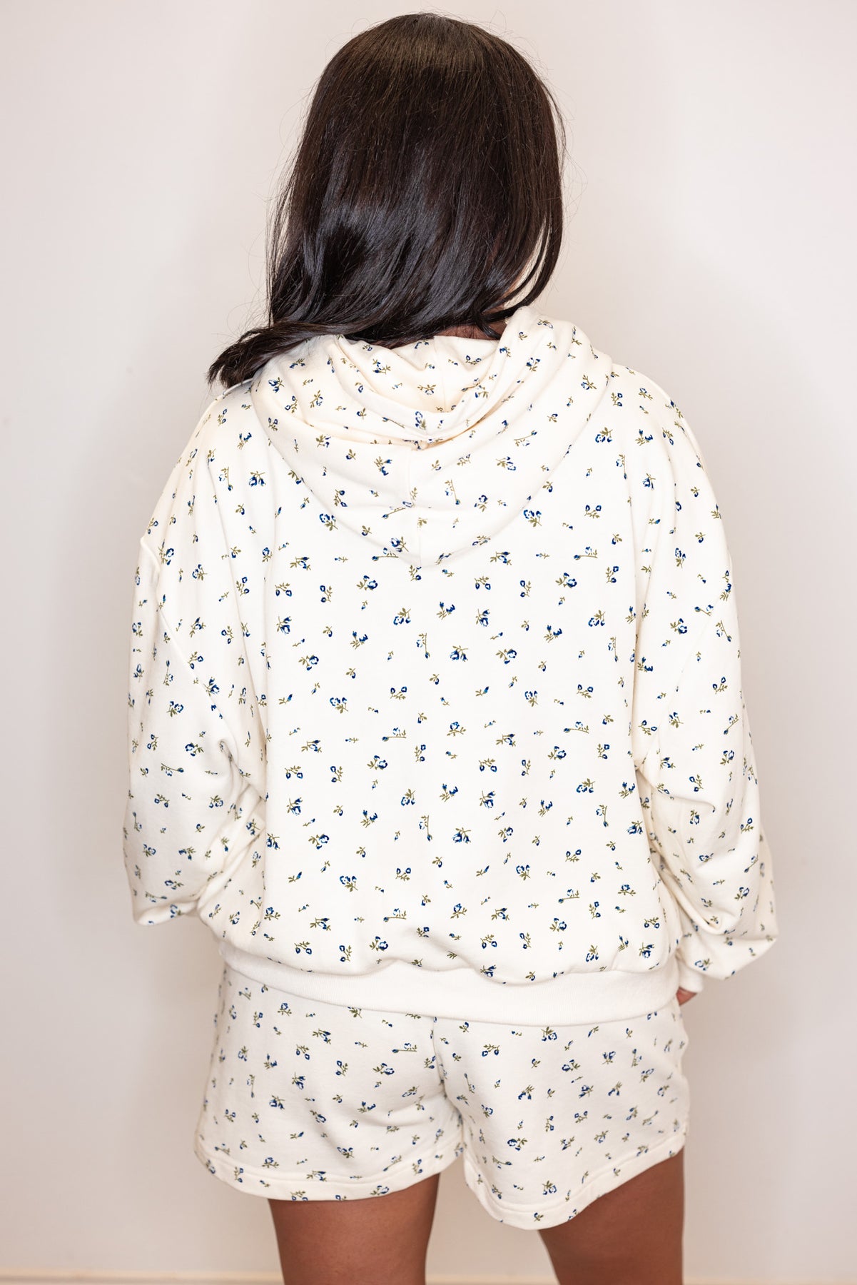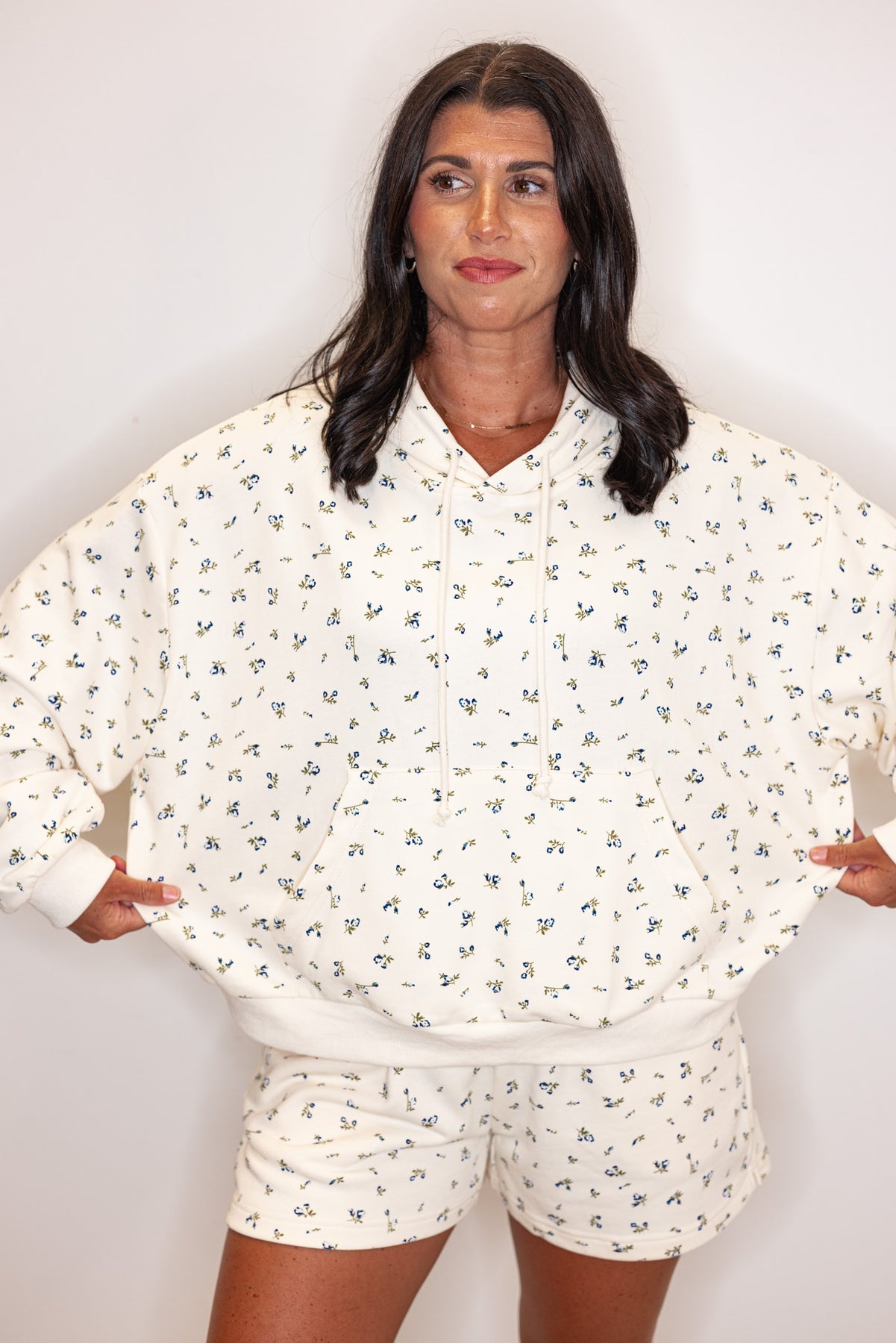 Wrap yourself in floral charm with the Always Blooming Cream Floral Hoodie! Made from soft cream French terry knit, it features a delightful blue and olive floral print that adds a fresh pop of color. The hood with drawstring keeps things snug, while cuffed long sleeves and a banded bottom hem ensure a comfy fit. Plus, the kangaroo front pocket is ideal for keeping your hands warm or stashing little treasures. Pair with the matching shorts for an outfit that's perfect for playful days and relaxed vibes!