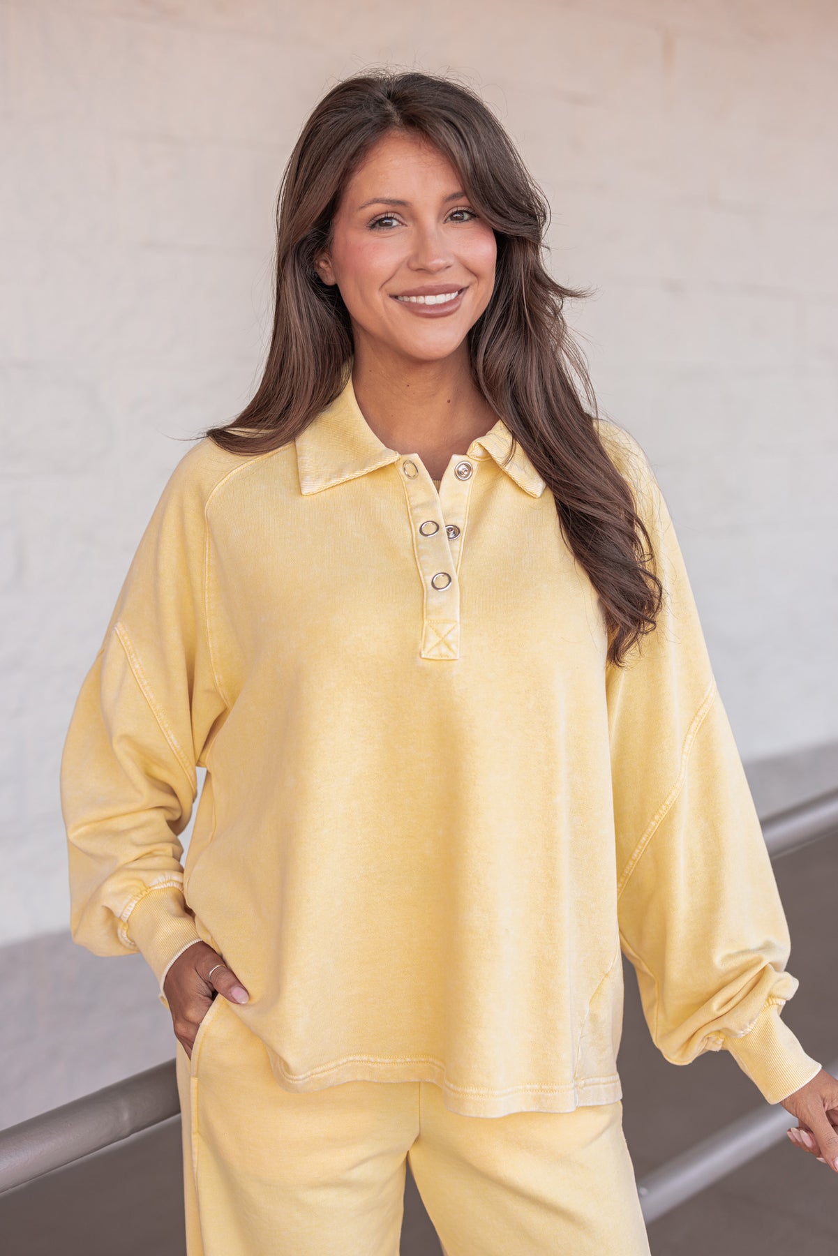 Get ready for Casual Vibes and compliments galore in this super cute butter yellow pullover! Featuring a henley neckline with snap front closure and collar, cuffed long balloon sleeves, and a locker loop in back with stitched patch detail. SHOP the matching tank here & matching pants here!