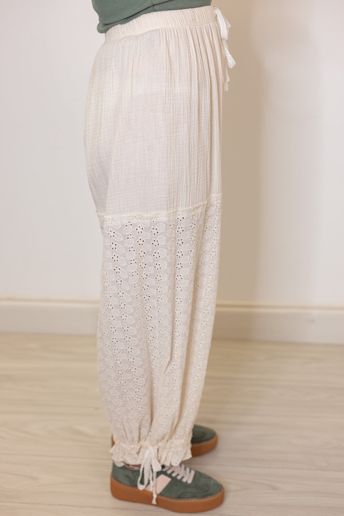 Women's eyelet lace and gauze wide balloon leg jogger pants in natural by POL showing up close side view