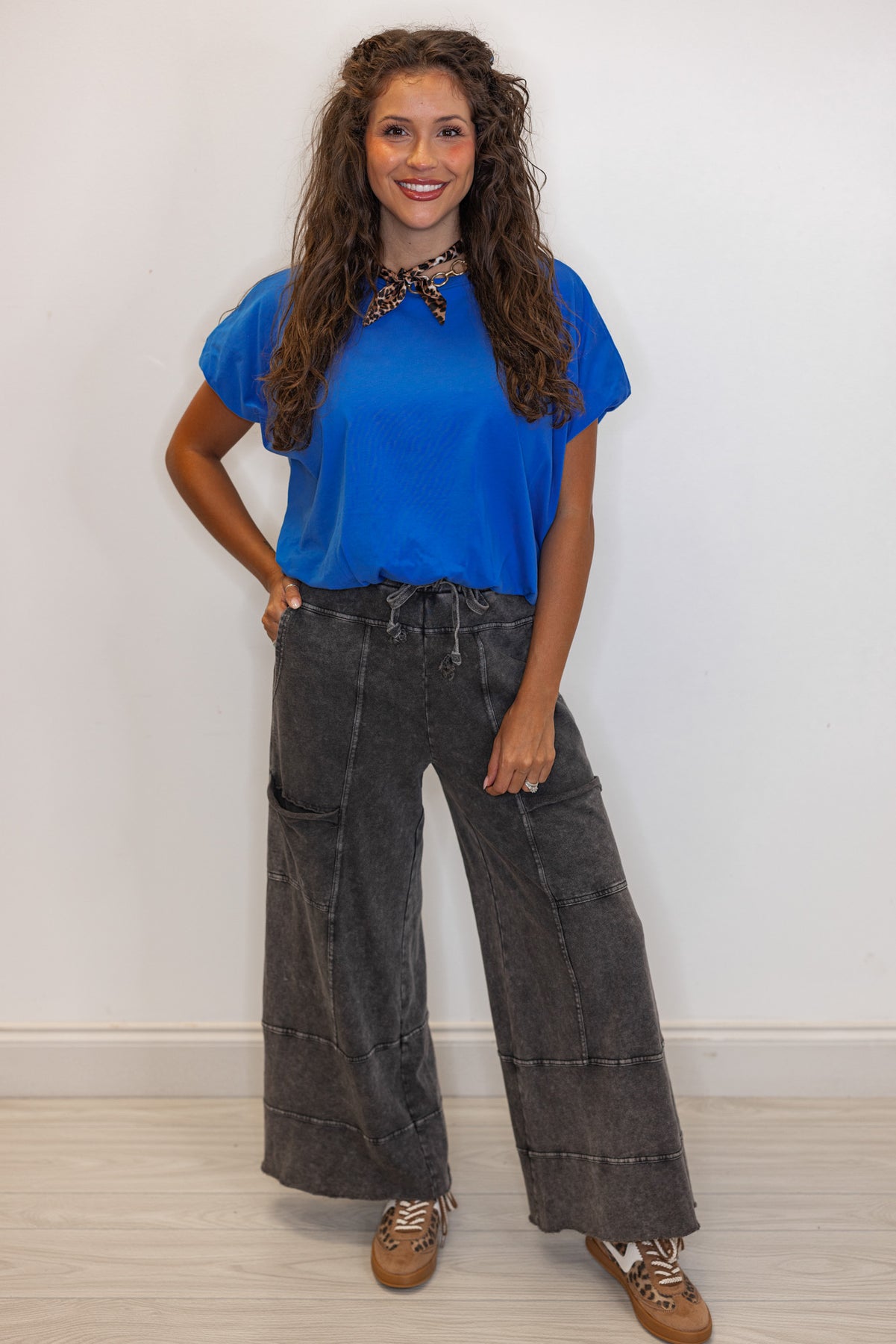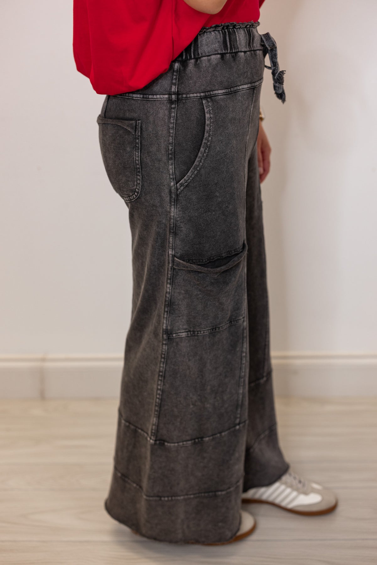 These terry knit pants are both trendy and comfy! Mineral washed black french terry knit fabric, featuring drawstring elastic waistband, side pockets, front pockets above the knee, back pockets, wide legs, raw bottom hemline, and reverse seam details throughout. You will love how great you feel in these babes everyday!
