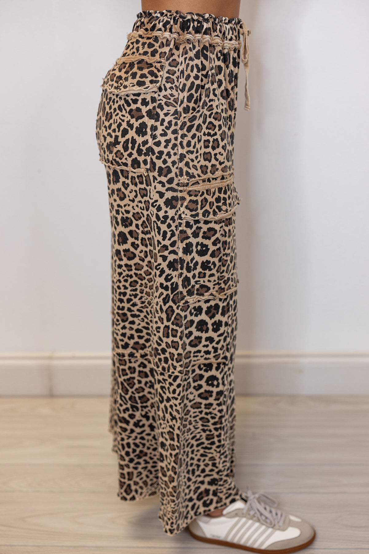 Bring bold style and comfort together with the Limitless Leopard Print Mocha Pants! Featuring a playful leopard print in mocha and black, these cropped wide-leg pants are easy to wear with a drawstring waistband for a perfect fit. Front, back, and side pockets add practical flair, making them your new favorite for effortless, fun looks! Shop the look: Brown Knit Top