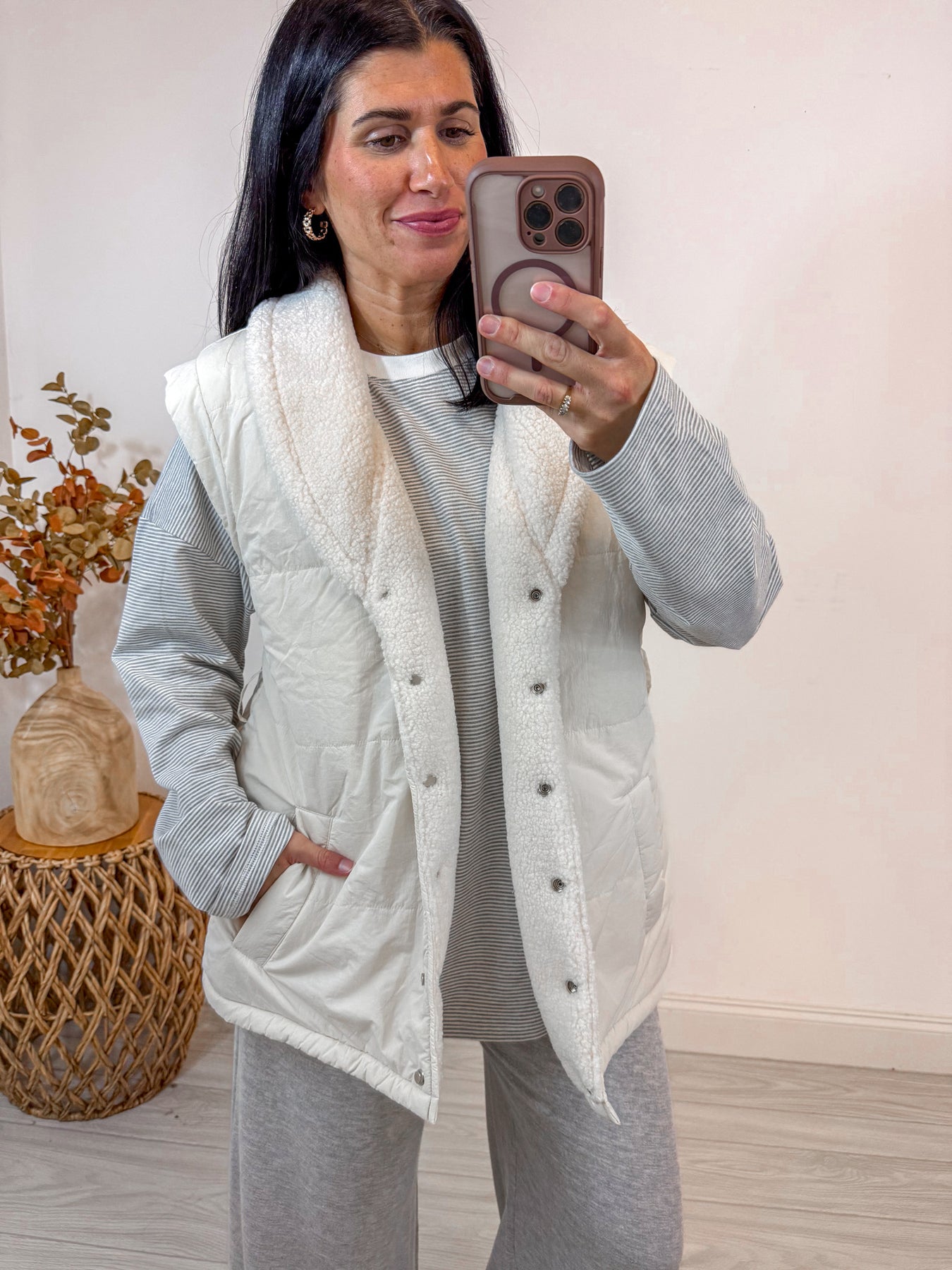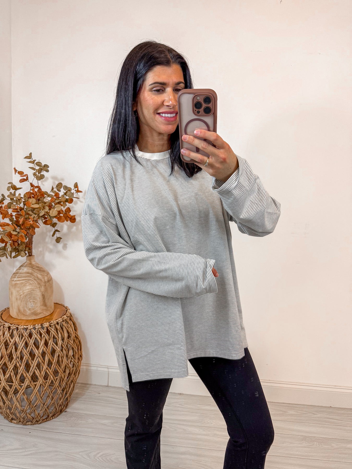 Stripes never go out of style, and this oversized knit top proves it! Featuring a classic heather grey and white striped pattern with a cozy crew neckline and long sleeves, it's the perfect striped piece for any season. The side slits at the hem add just the right amount of movement and edge. Throw it on with your favorite leggings or dress it up—this versatile top does it all! Shop the look: Booty Boost Leggings | Grey Wide Leg Sweatpants | Reversible Vest