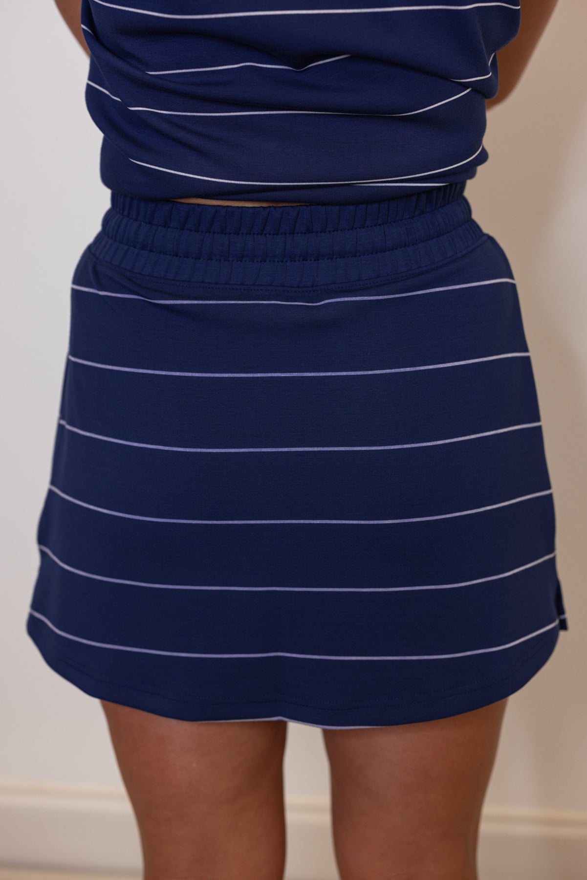 Elevate your wardrobe with this luxe v elastic waist skort, crafted from our signature silky smooth and lightweight scuba fabric in a cute striped pattern. Pair with the matching top for an outfit that's perfect for playful days and relaxed vibes!