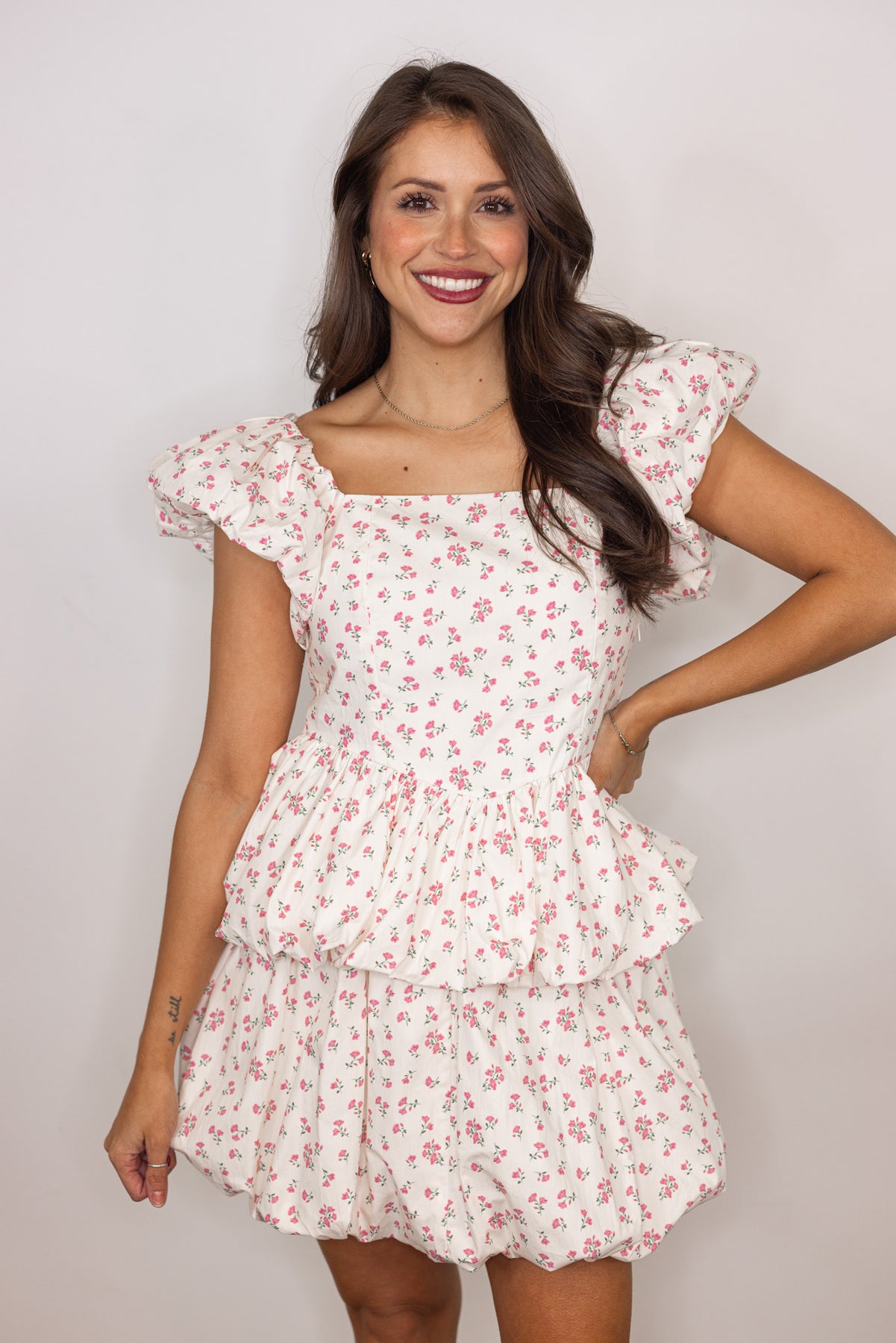 Embrace your girly side with this poplin cream skirt featuring a bubble hem, hidden zipper side closure, and lined with shorts. The dainty pink floral print adds a touch of sweetness to any outfit! Pair it with the matching top for a complete Dainty Florals look. Too perfect!